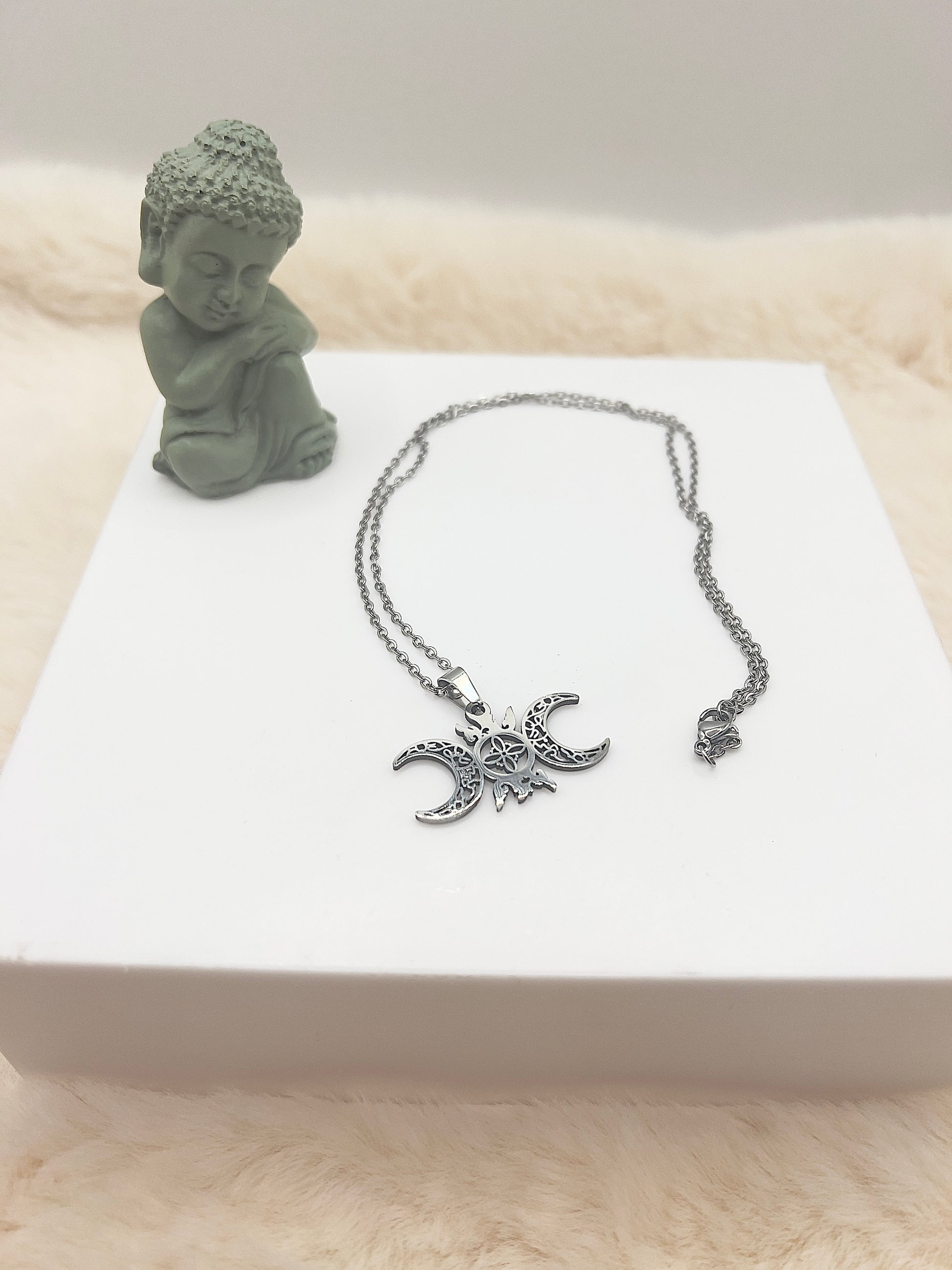 Diese silberfarbene Edelstahlkette mit Dreifach-Mond-Keltenknoten -Anhänger ist ein wunderschönes Schmuckstück für alle, die den Mondzyklus, feminine Energie oder spirituelle Symbole lieben. Der Anhänger zeigt die drei Mondphasen – zunehmender Mond, Vollmond und abnehmender Mond – kunstvoll vereint in einem harmonischen Design.
