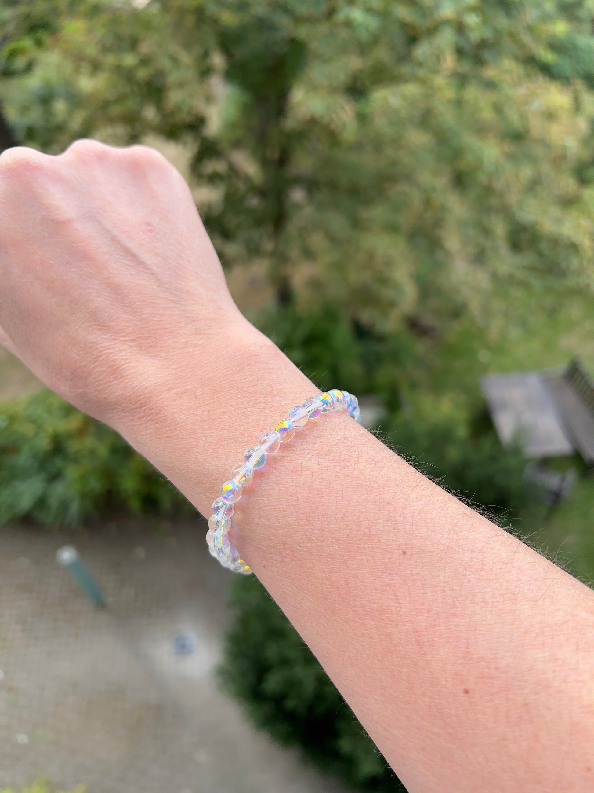 Ein zartes Schmuckstück voller Eleganz: Die transparenten Glasperlen (6 mm) mit Spiegeleffekt strahlen in opalisierenden Farben – von sanftem Gelb über Rosé bis hin zu schimmerndem Blau. Durch ihre kleinere Größe wirkt das Armband filigran, leicht und besonders fein am Handgelenk, während es dennoch im Licht magisch funkelt.