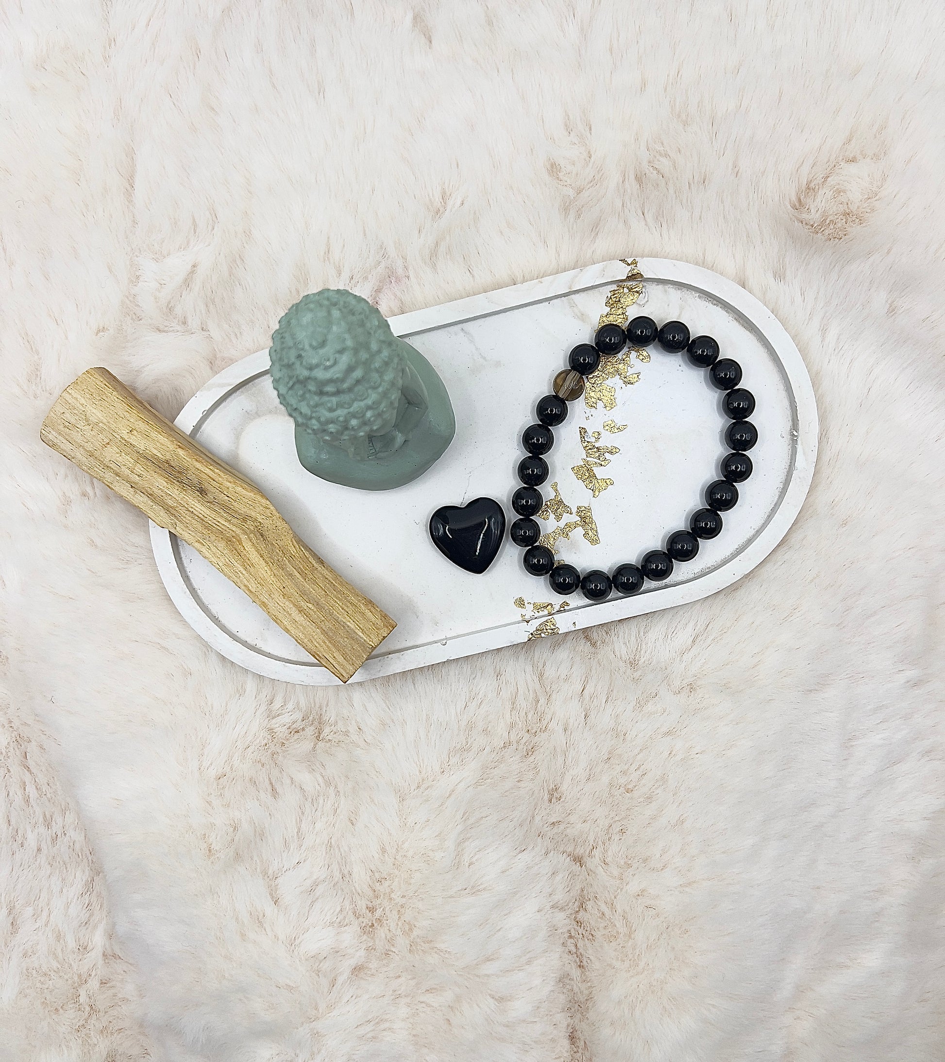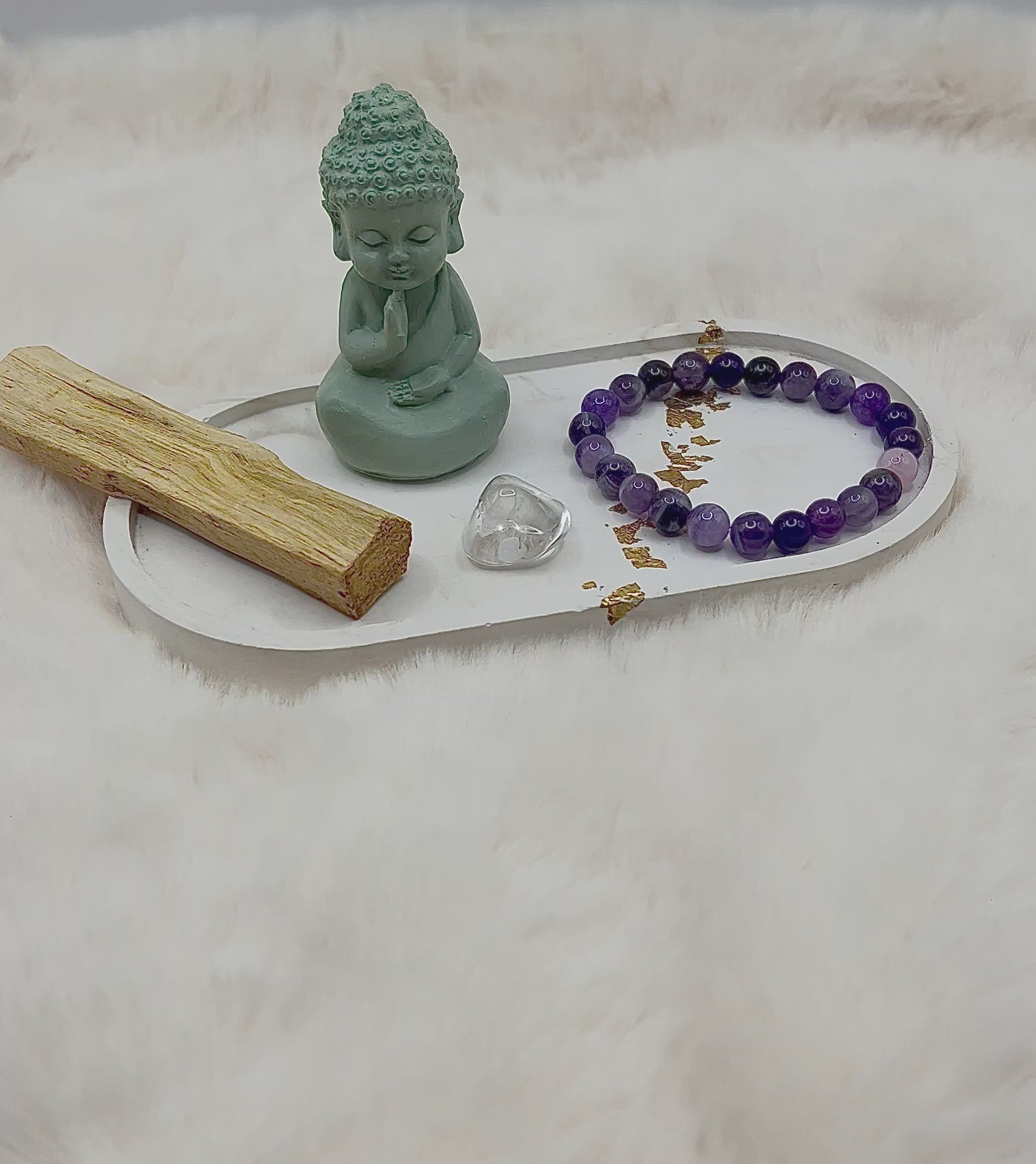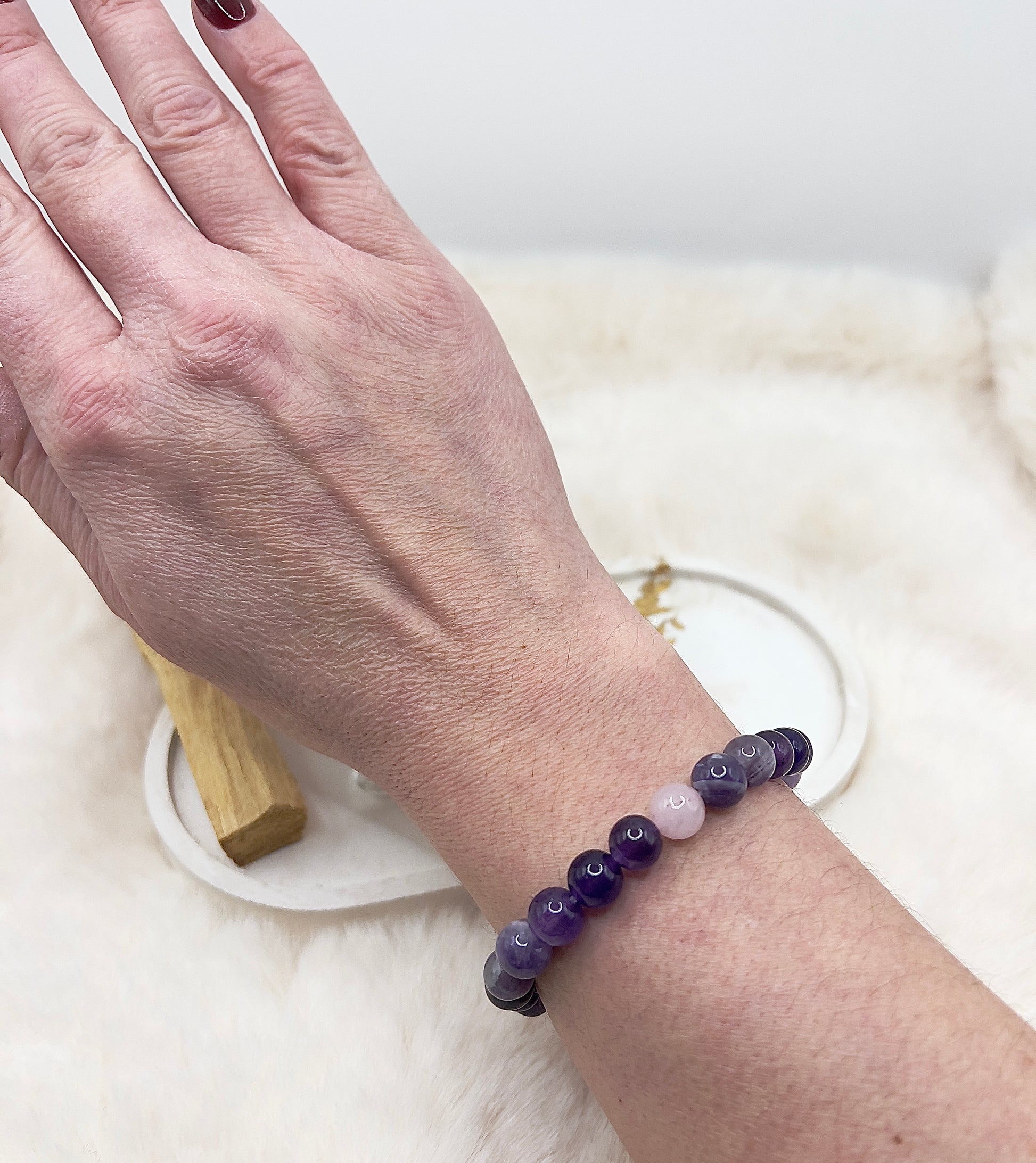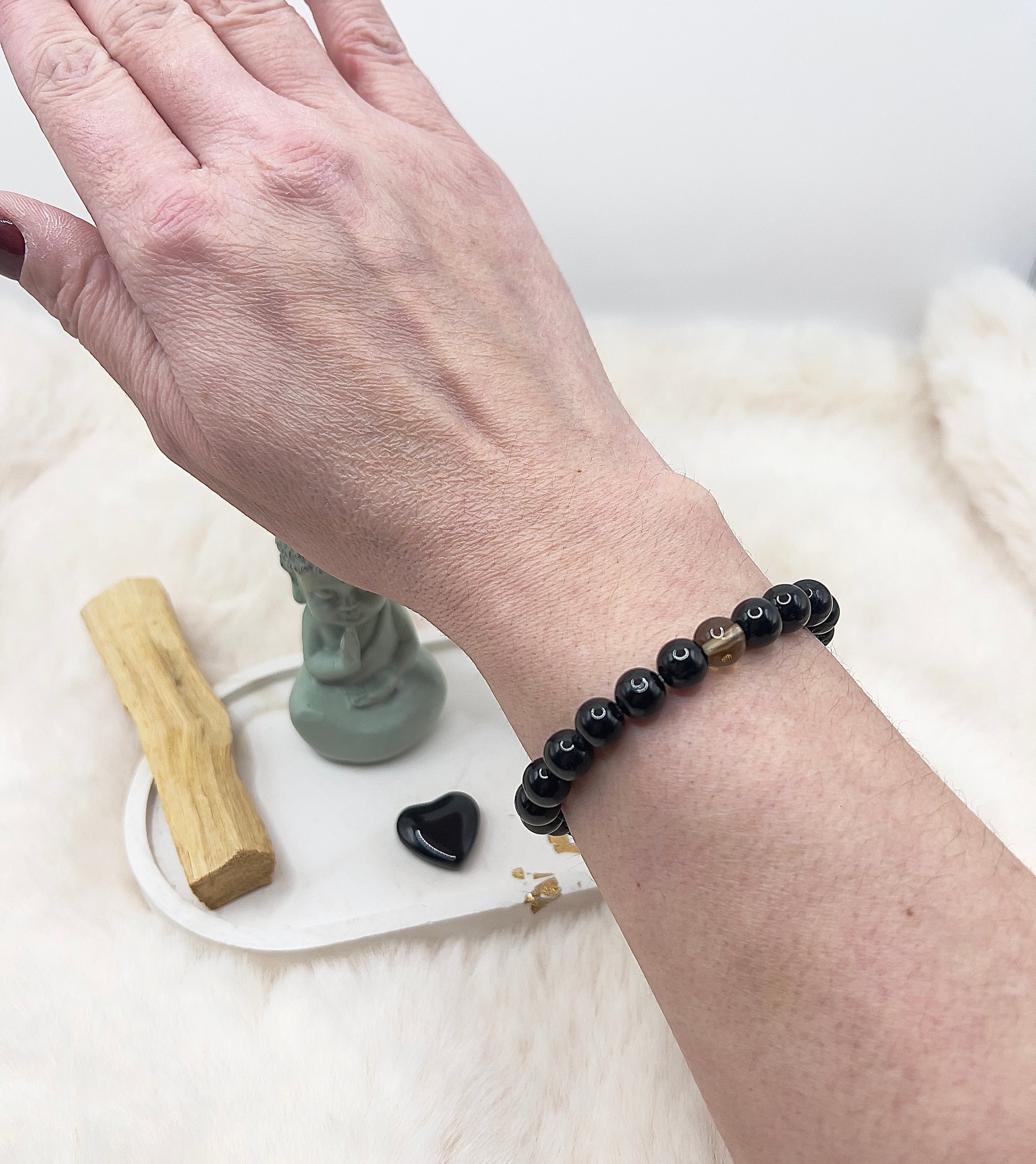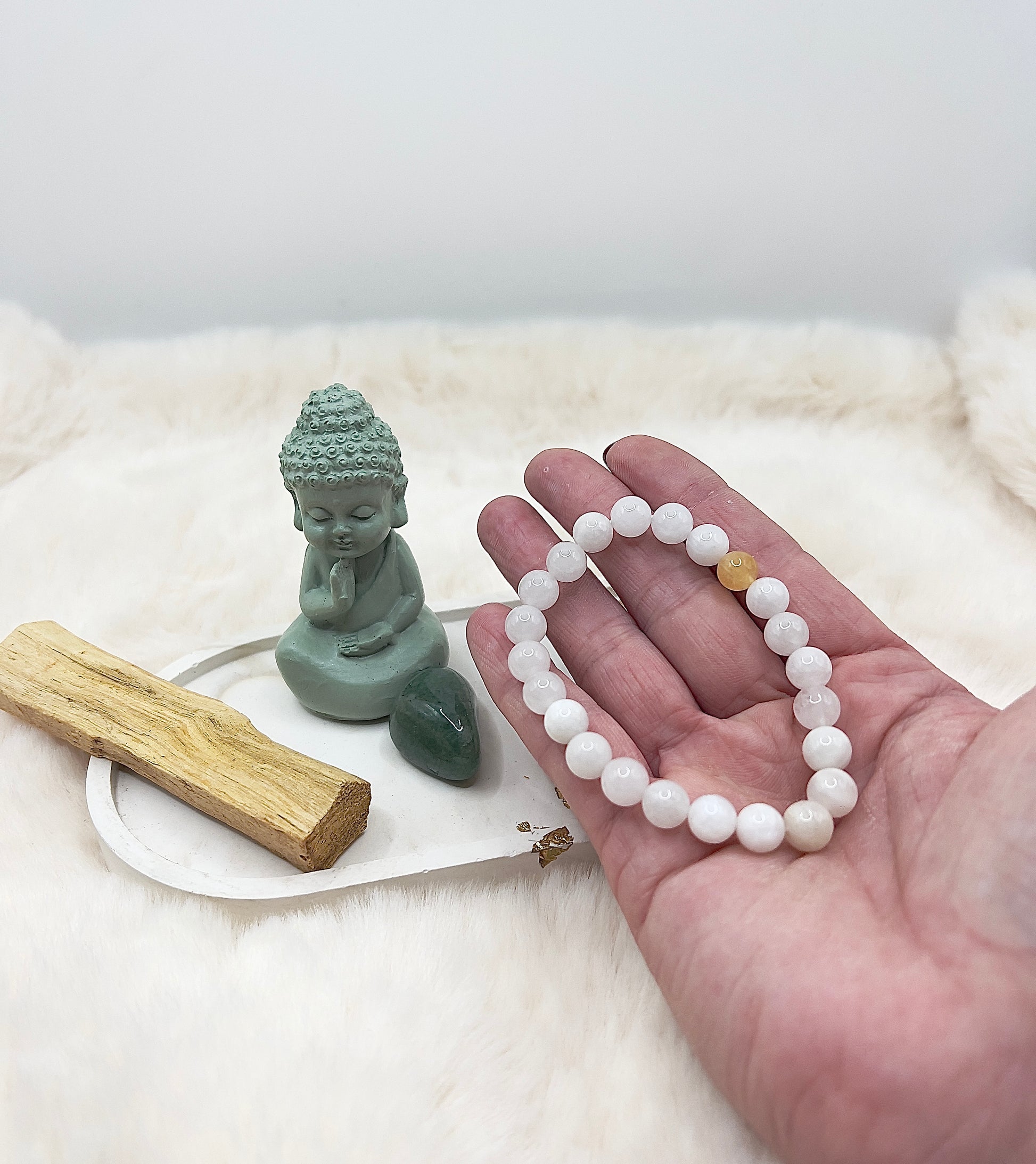 Drei liebevoll zusammengestellte Mini-Sets – jedes bestehend aus einem handgefertigten 8-mm Armband, einem passenden Stein und einem Stück Palo Santo.