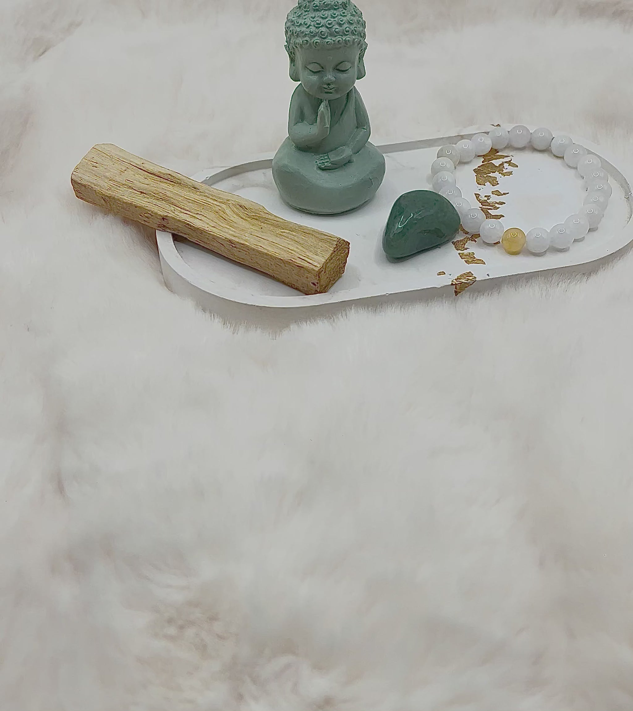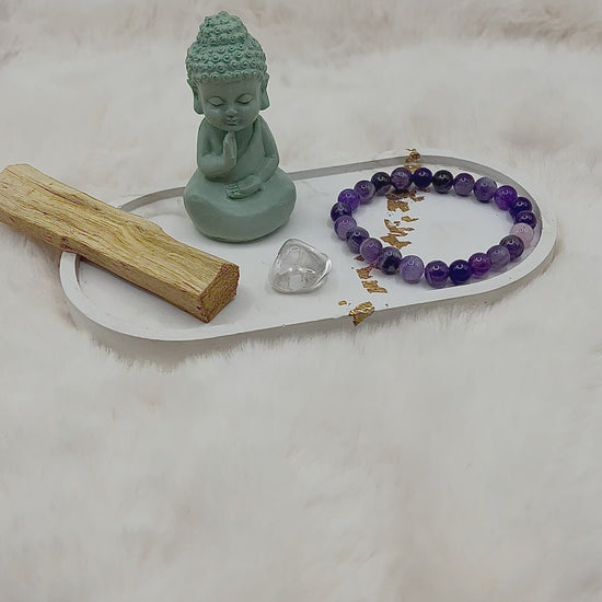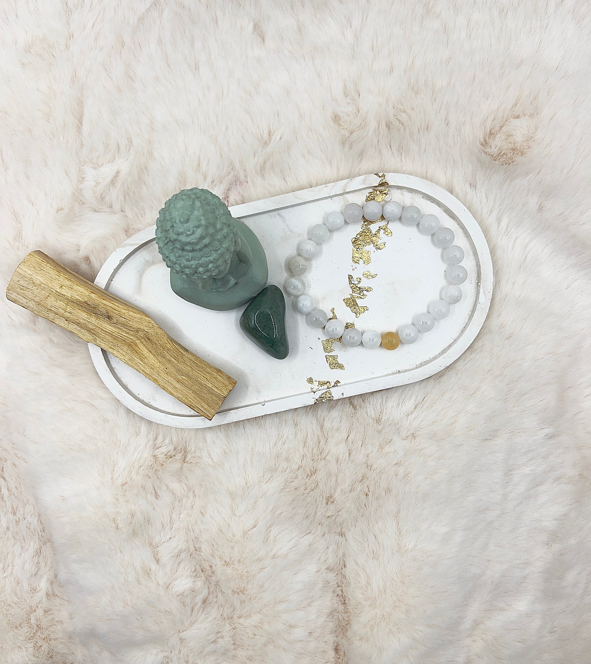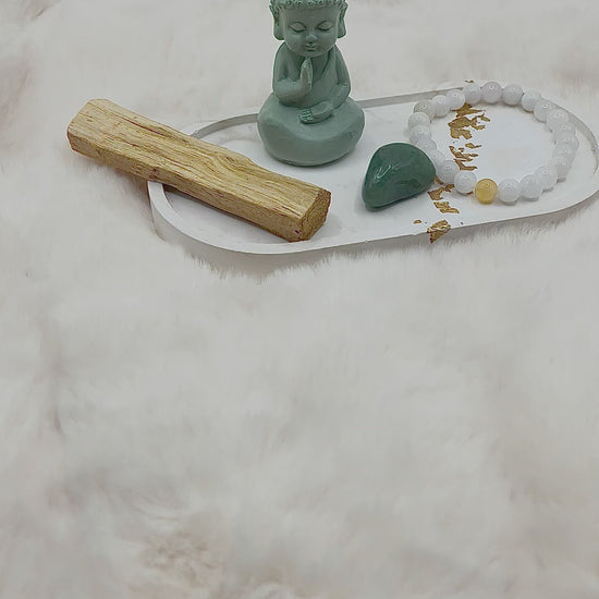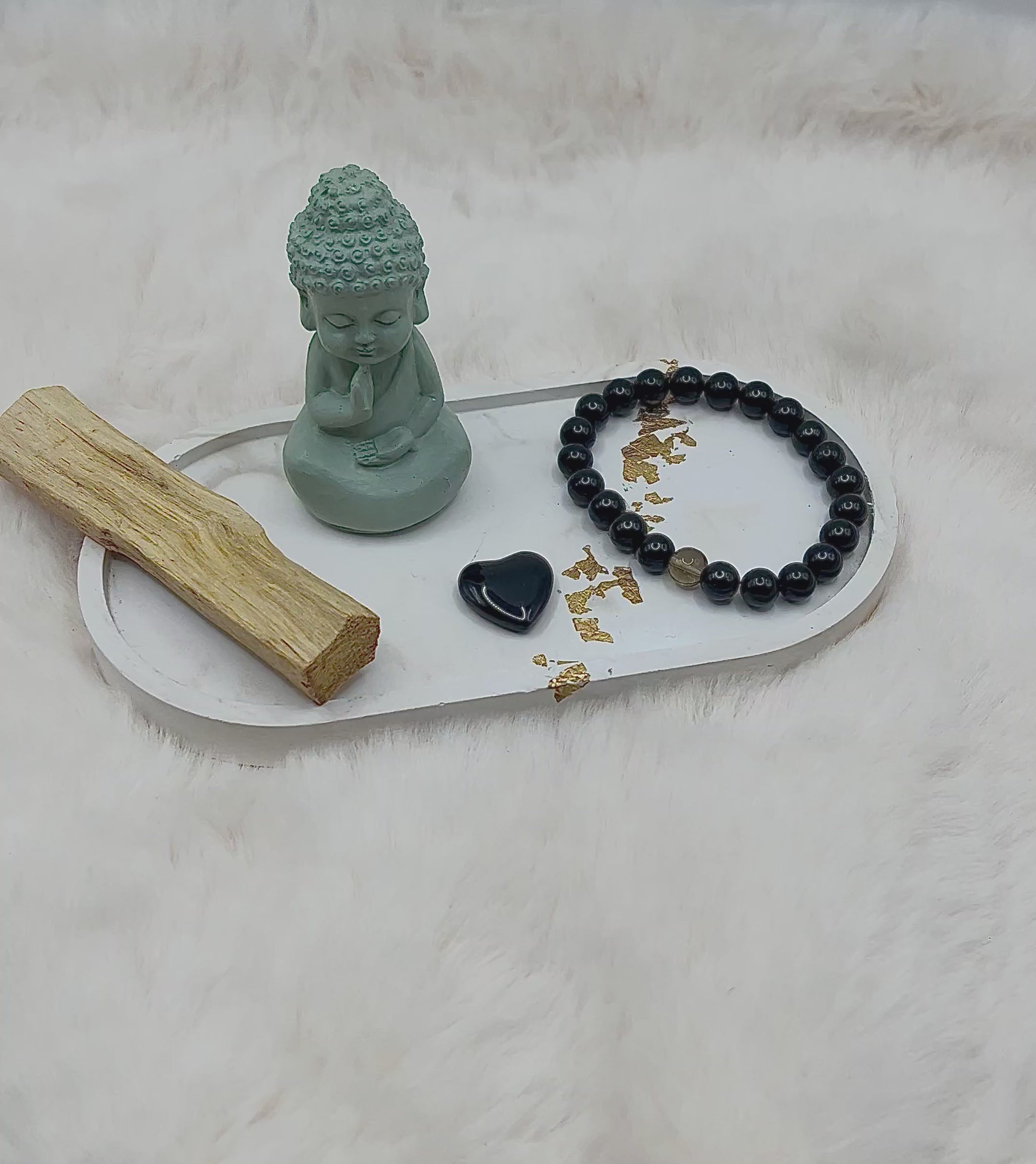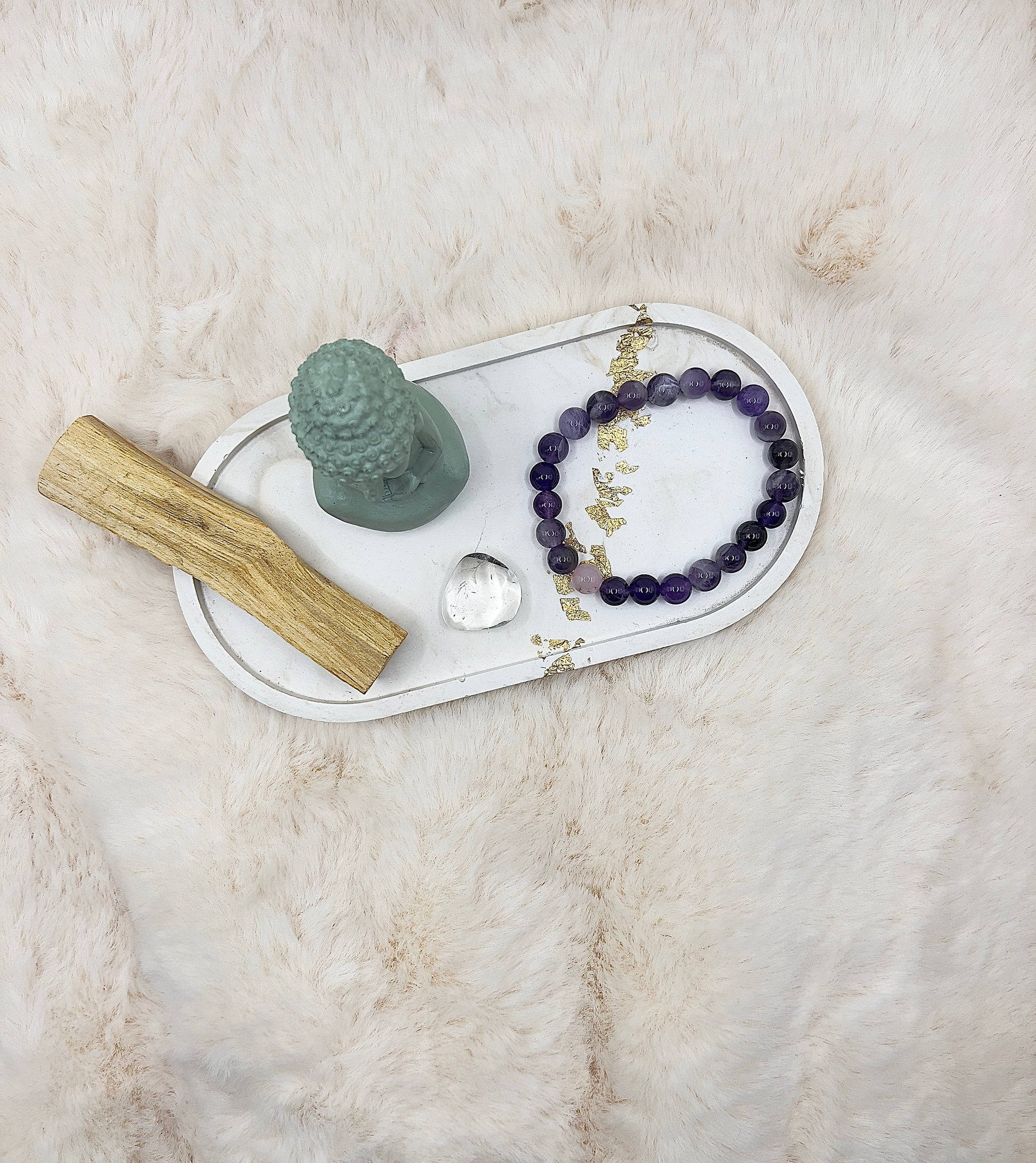 Drei liebevoll zusammengestellte Mini-Sets – jedes bestehend aus einem handgefertigten 8-mm Armband, einem passenden Stein und einem Stück Palo Santo.