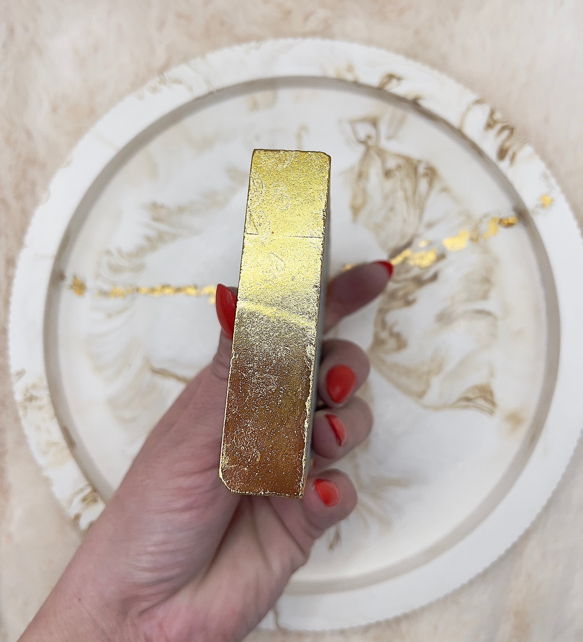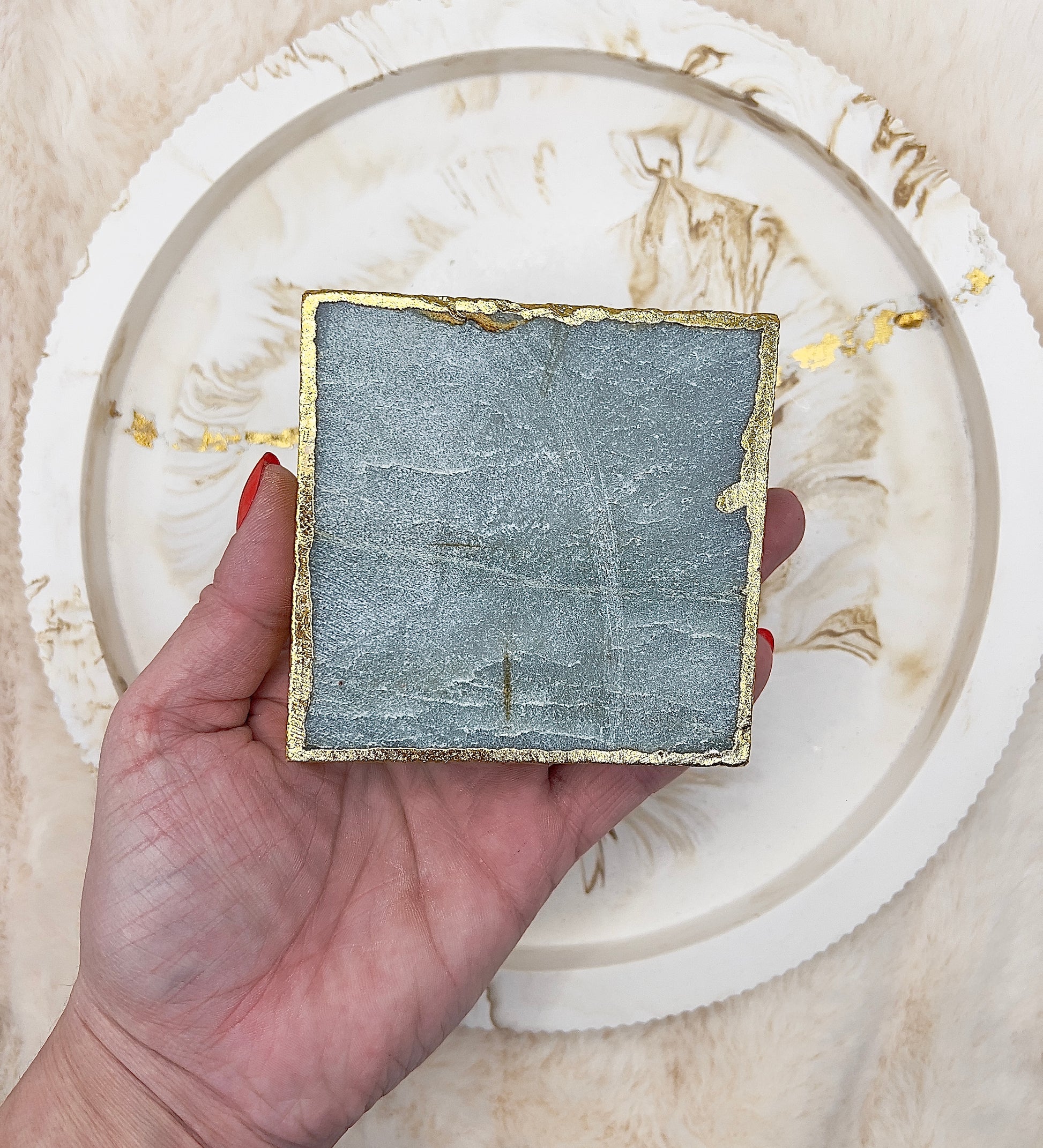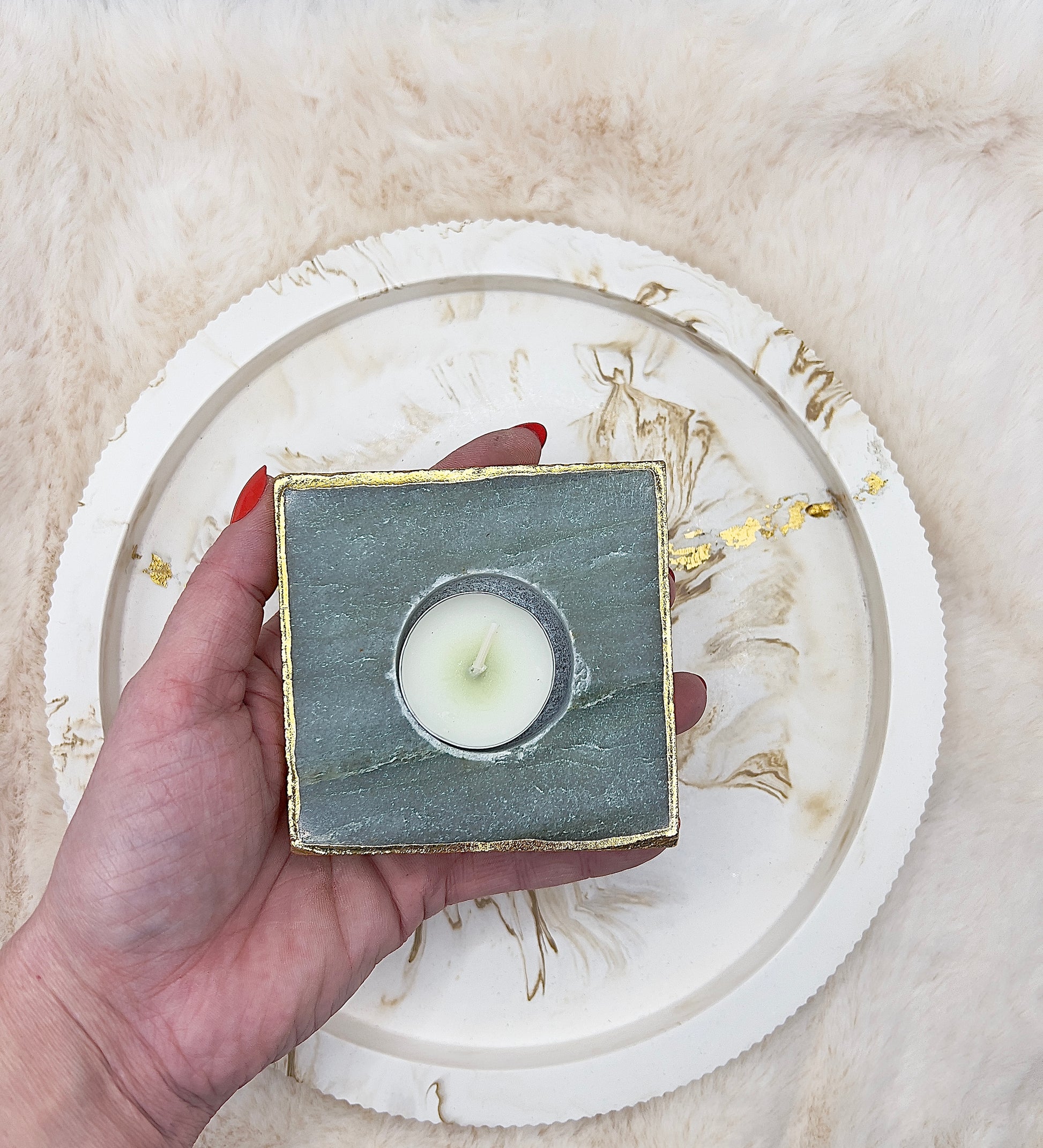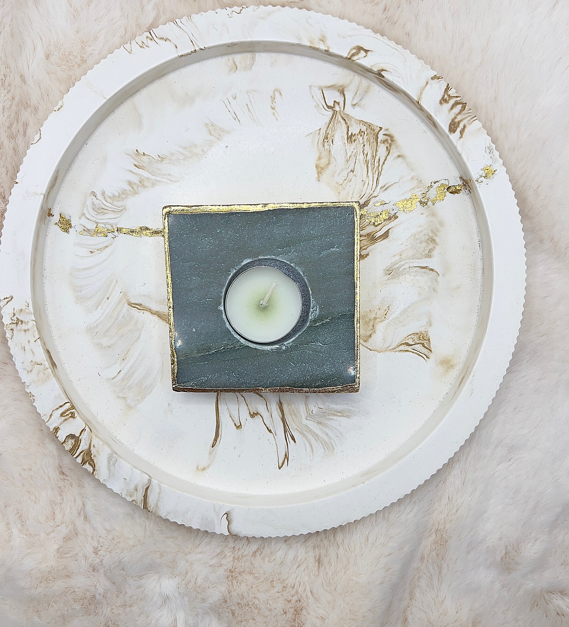 Der Naturstein wurde liebevoll von Hand geschliffen, sodass seine Struktur wunderschön zur Geltung kommt. Die Kanten sind rundum aufwendig mit 24 Karat Echtgold vergoldet, was dem Teelichthalter einen hochwertigen, luxuriösen Charakter verleiht und das Kerzenlicht besonders edel reflektiert.