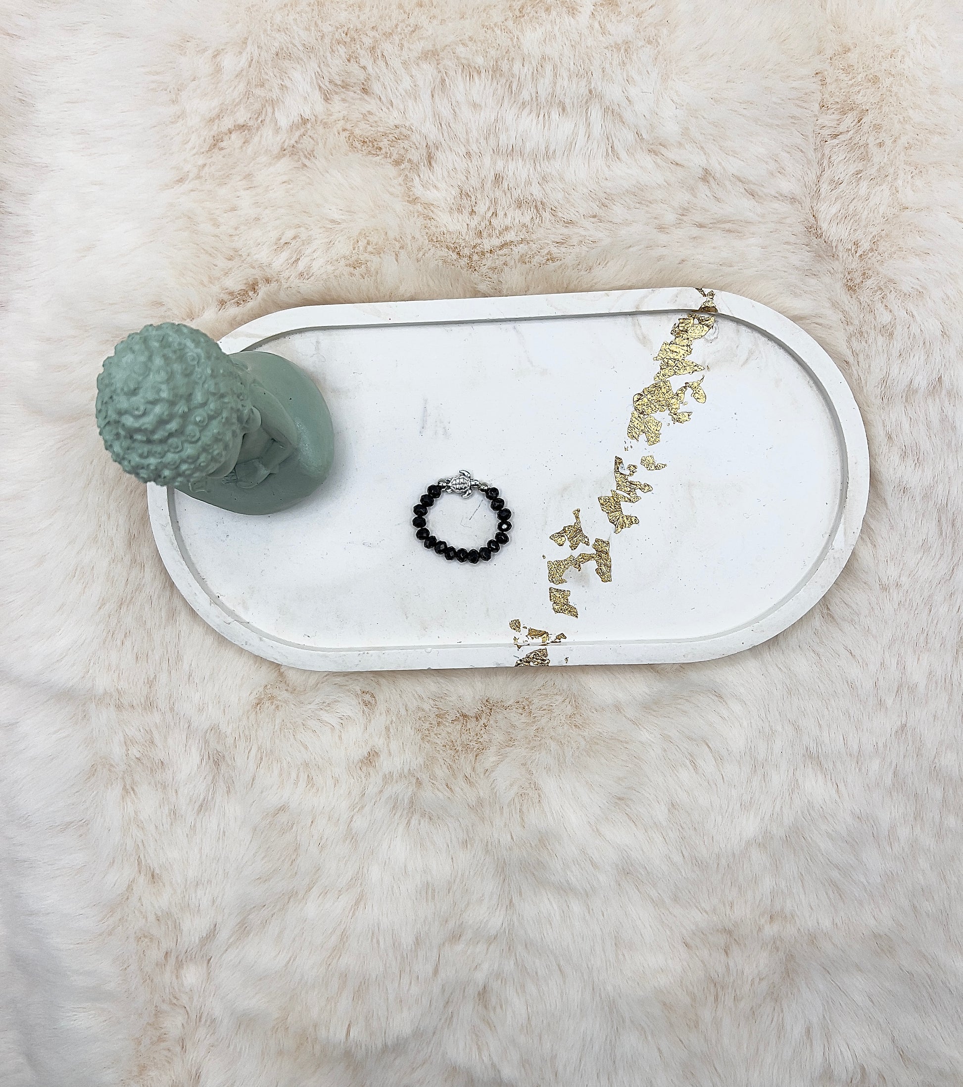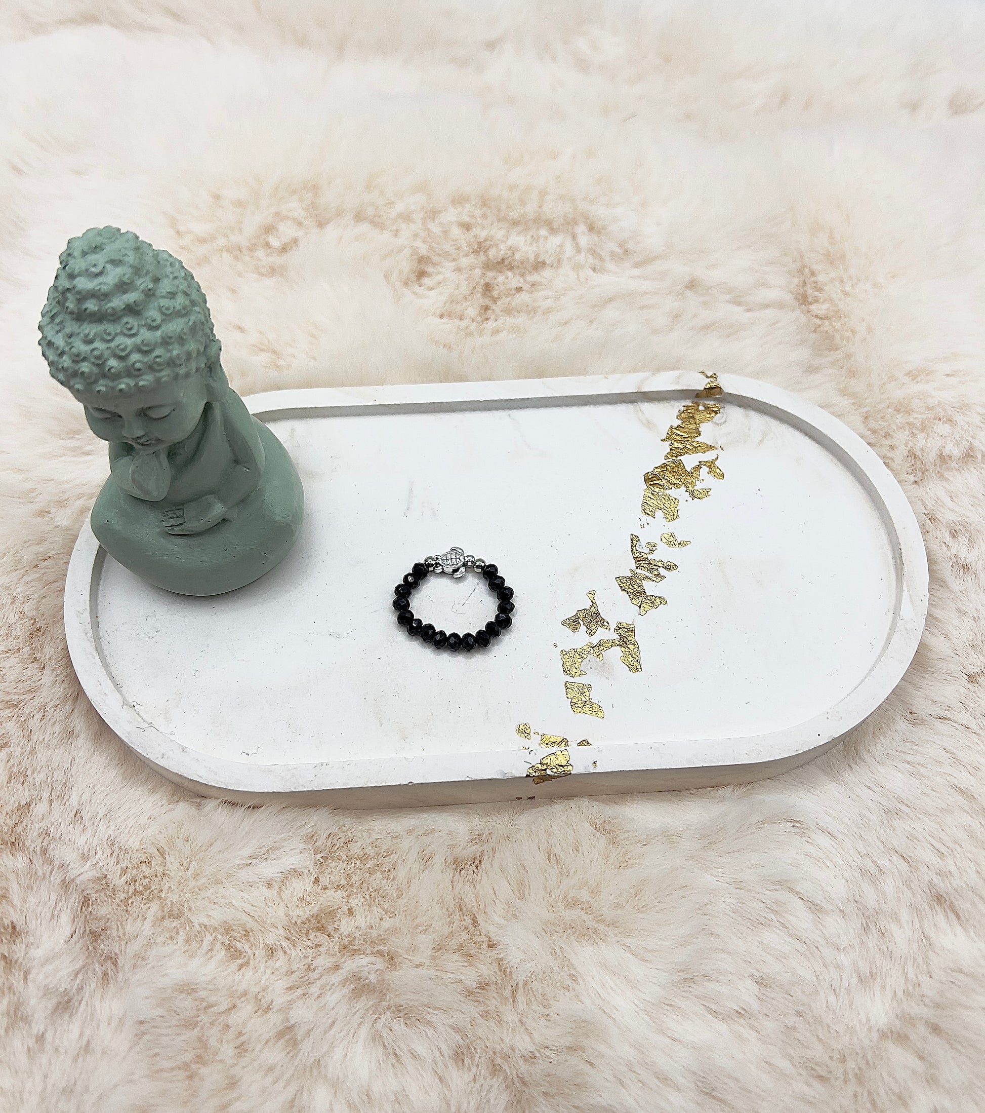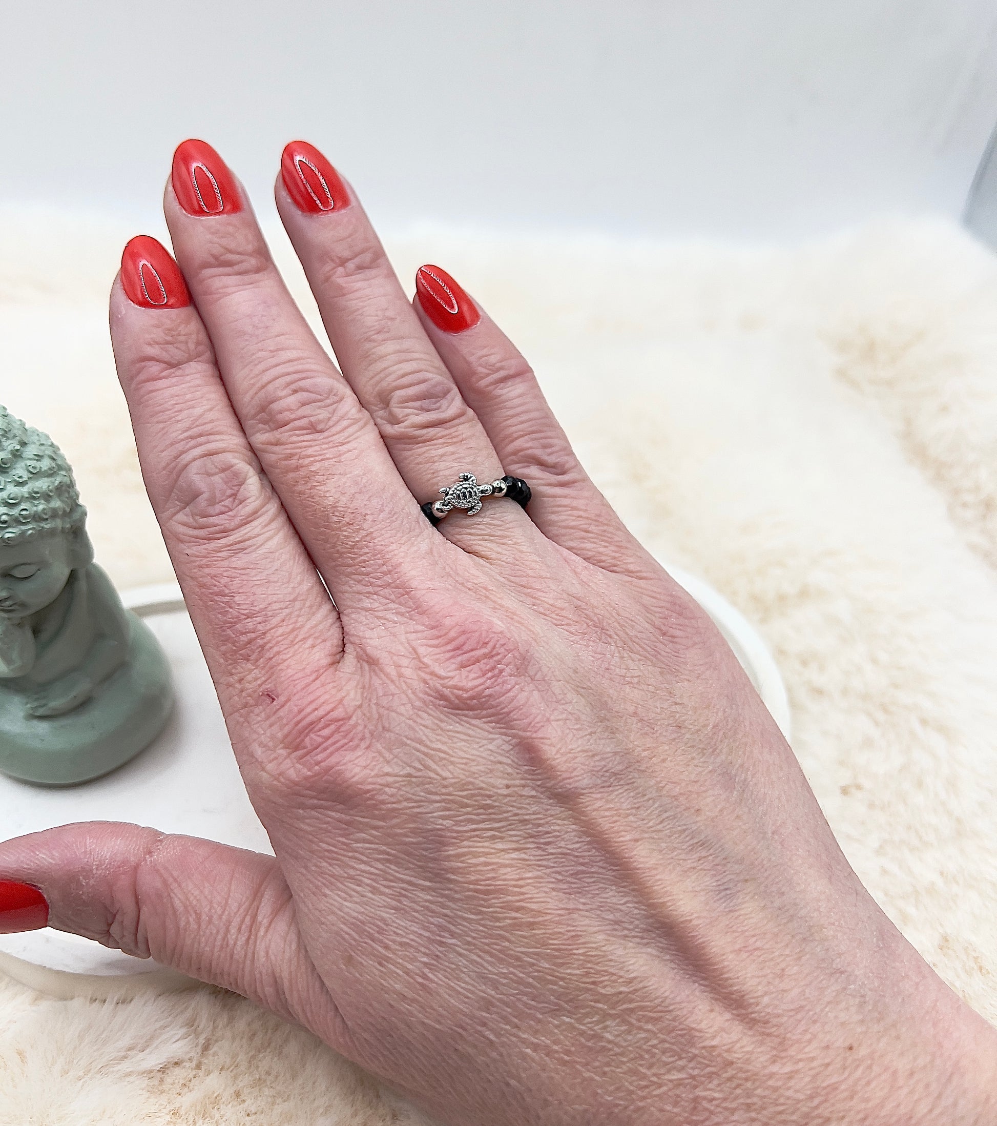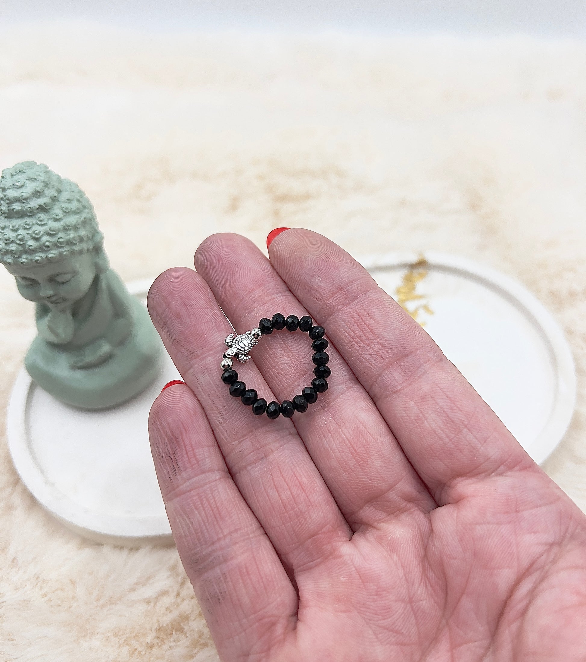 Dieser handgefertigte Edelsteinring aus facettiertem schwarzem Turmalin kombiniert filigrane Eleganz mit einem liebevollen Detail. Die ca. 3,5 mm großen Edelsteinperlen werden durch silberfarbene Edelstahl-Abstandsperlenergänzt. Als besonderes Highlight ziert eine Schildkröte aus Edelstahl silber den Ring – ein Symbol für Ruhe und Beständigkeit.