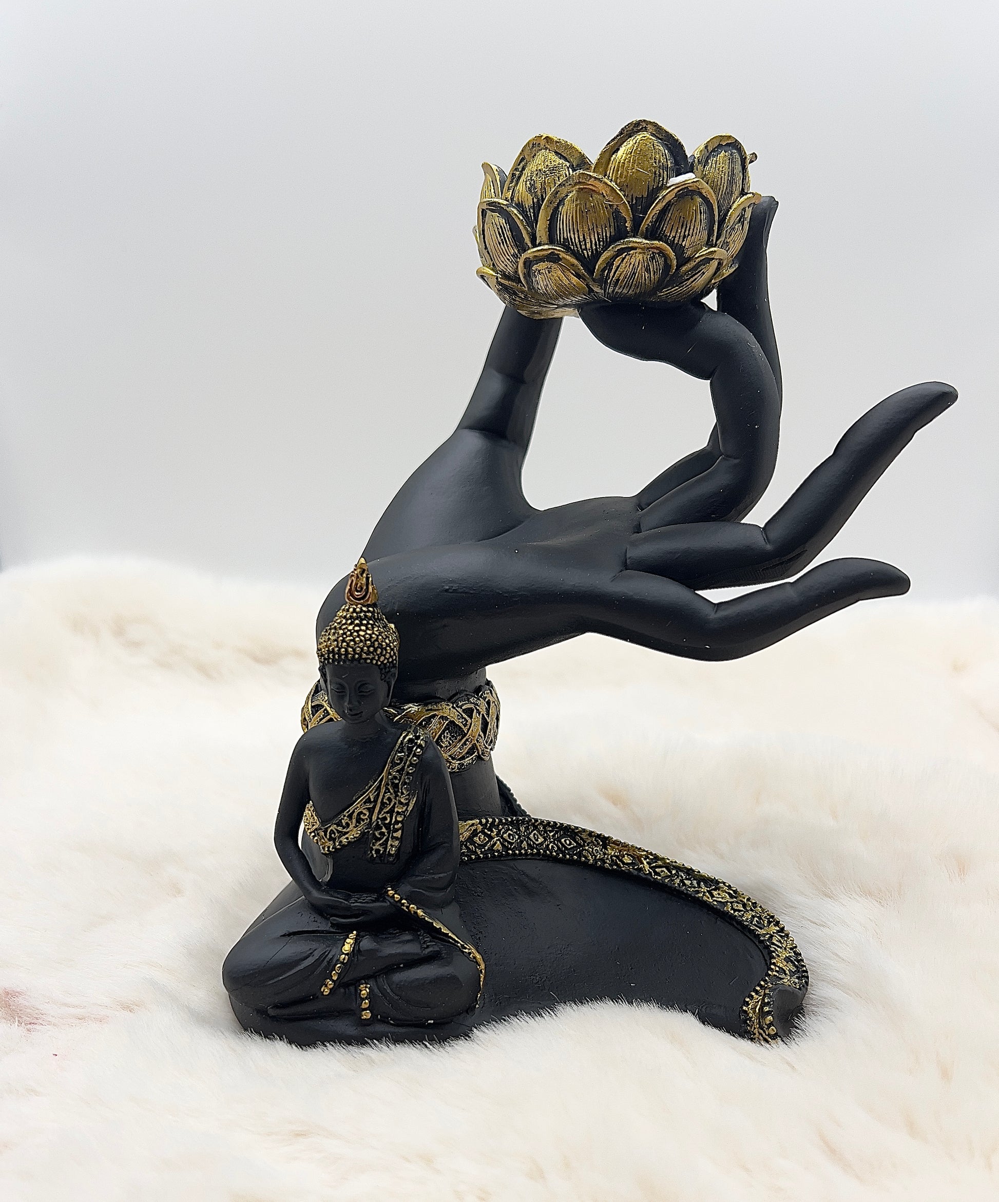 Die Statue zeigt eine ruhende Buddha-Figur vor einer aufgerichteten Hand, die eine goldene Lotusblüte als Teelichthalter trägt – ein beeindruckendes Symbol für Erleuchtung, Schutz und inneres Gleichgewicht.