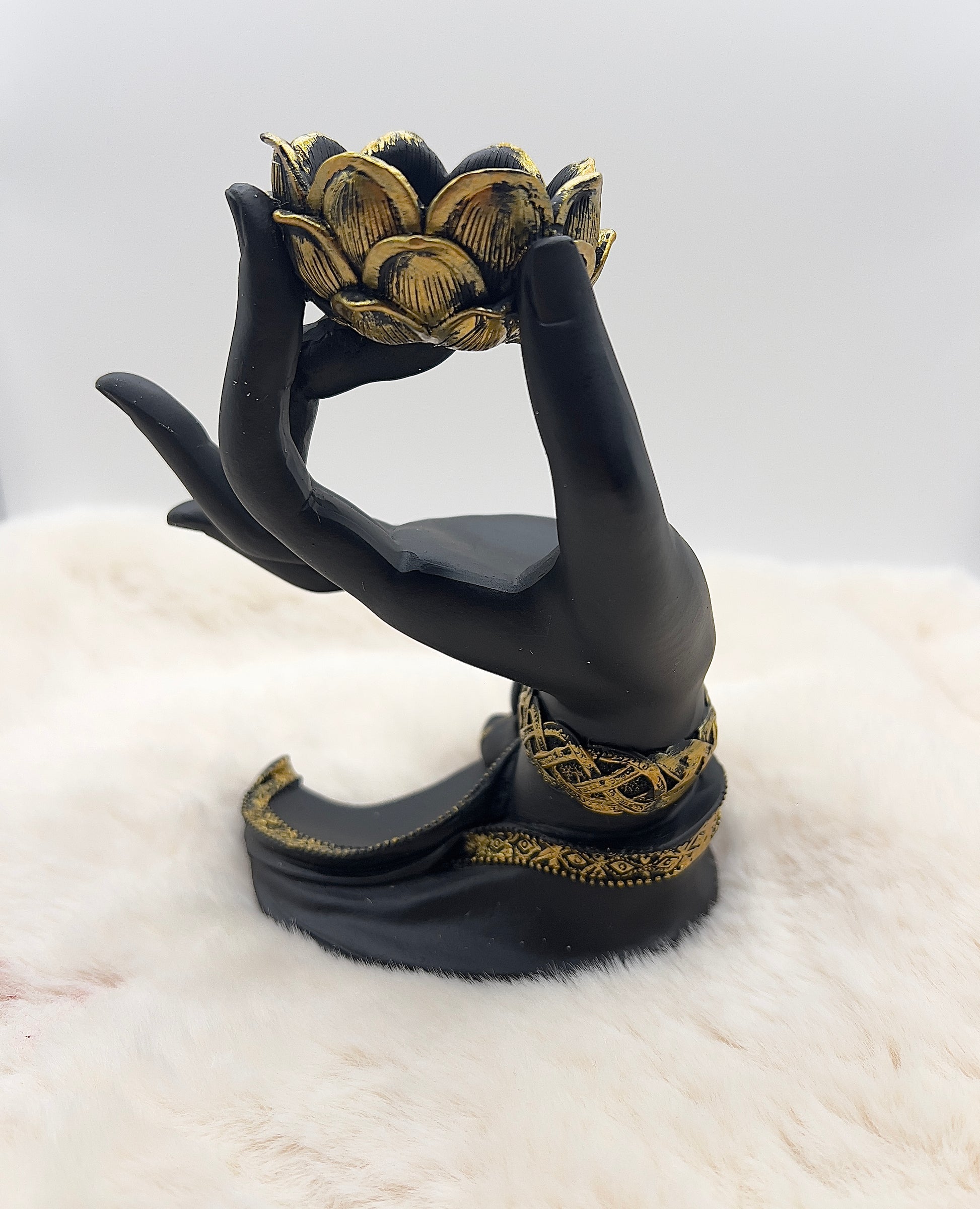 Elegante Buddha-Figur mit goldener Lotus-Hand – stilvolles Symbol für Ruhe, Licht & Achtsamkeit.