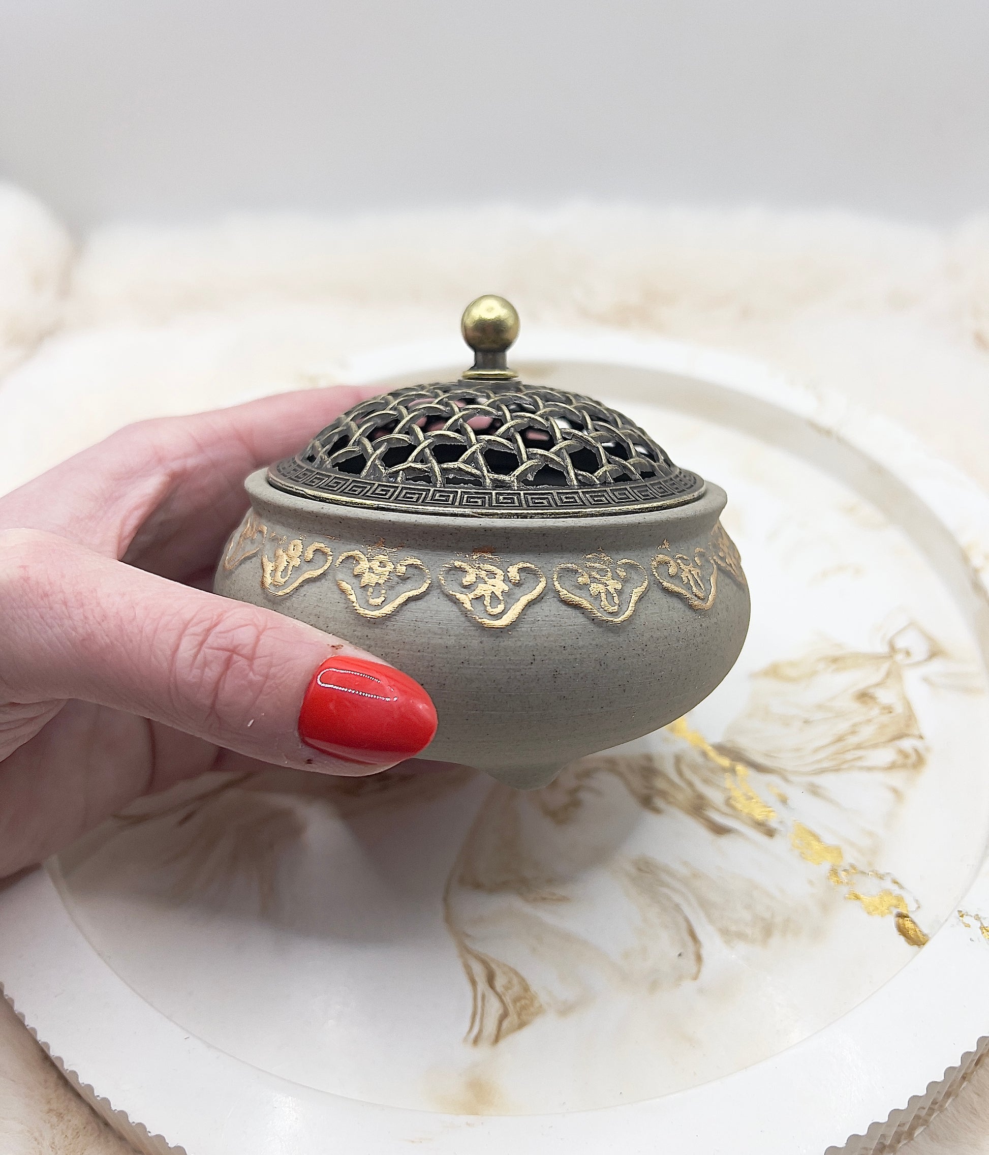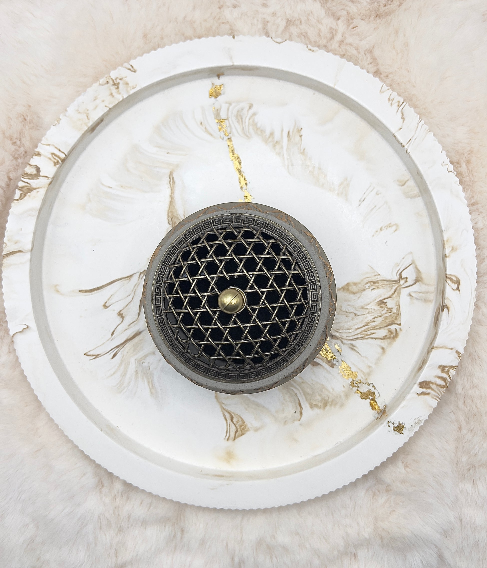 Die OberflĂ€che ist in einer dezenten Steinoptik gehalten und wird durch feine, goldfarbene Akzente am Rand ergĂ€nzt. Der dekorative Deckel mit Gitterstruktur rundet das Design harmonisch ab und macht die Schatulle zu einem stilvollen Blickfang â sowohl auf dem Altar als auch im Wohn- oder Schlafbereich.