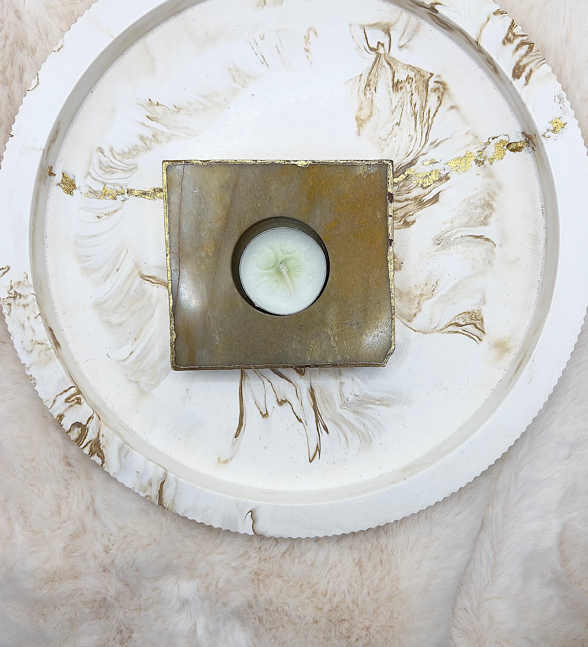 Mit einem Gewicht von 370 g und Maßen von ca. 9,2 × 8,2 cm bei einer Höhe von ca. 2 cm liegt dieser Teelichthalter massiv und wertig in der Hand. Das Teelicht sitzt sicher in der eingelassenen Vertiefung und taucht den Golden Healer in ein warmes, goldenes Lichtspiel, das seine natürliche Schönheit optimal zur Geltung bringt.