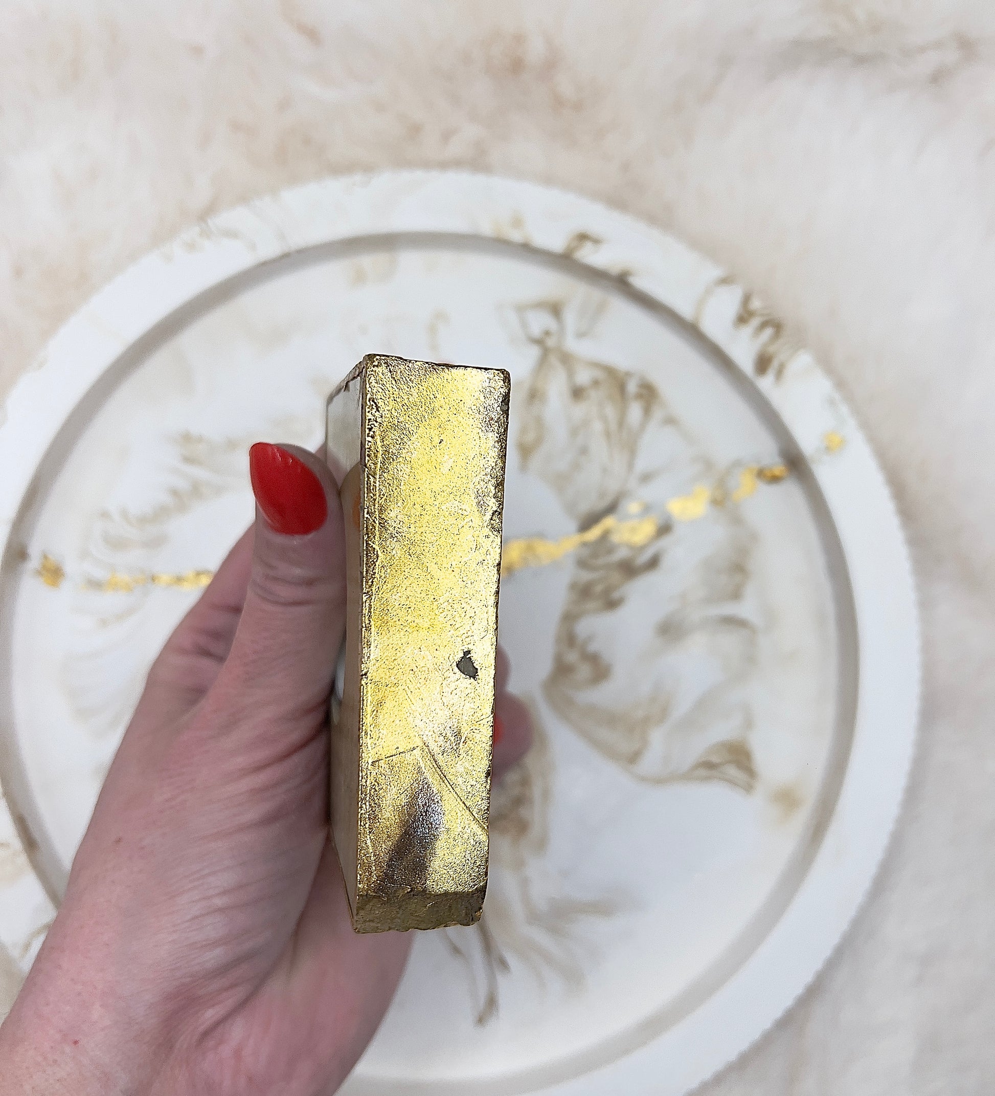 Die Ränder wurden liebevoll mit echtem 24-Karat Gold vergoldet, was einen auffälligen und zugleich edlen Kontrast erzeugt. Diese hochwertige Vergoldung macht jedes Stück zu einem echten Premium-Unikat – modern, stilvoll und kraftvoll in seiner Wirkung.