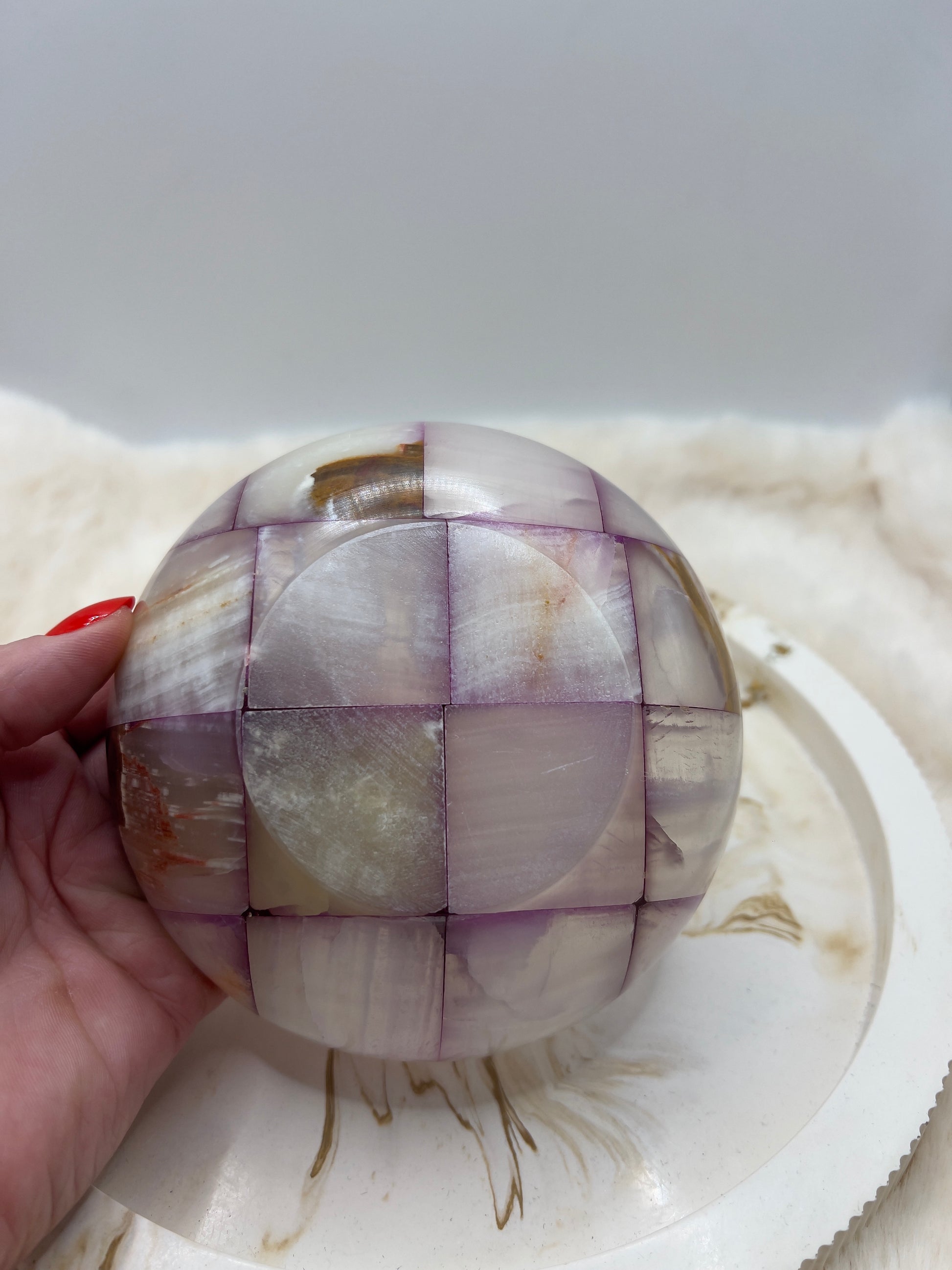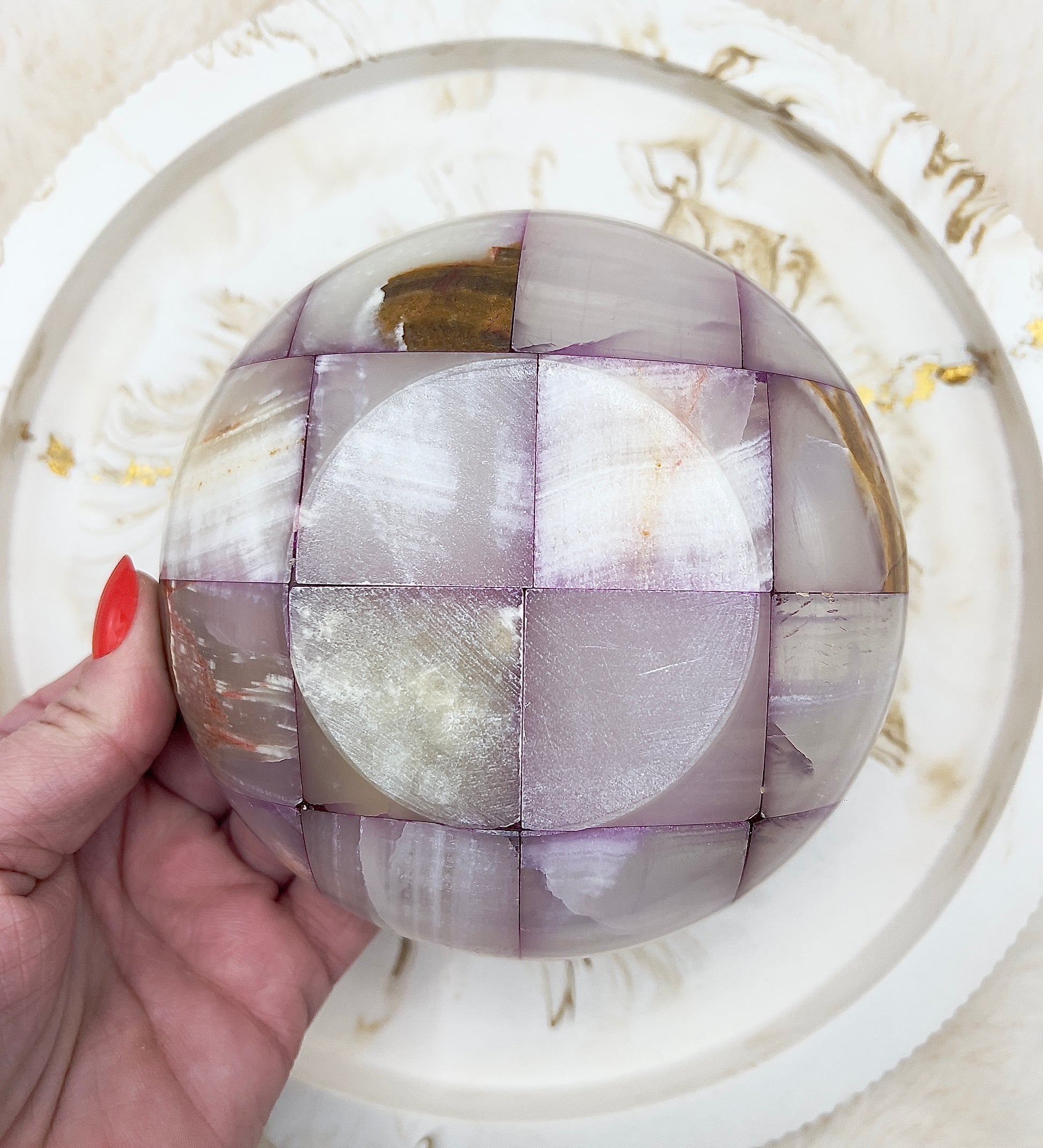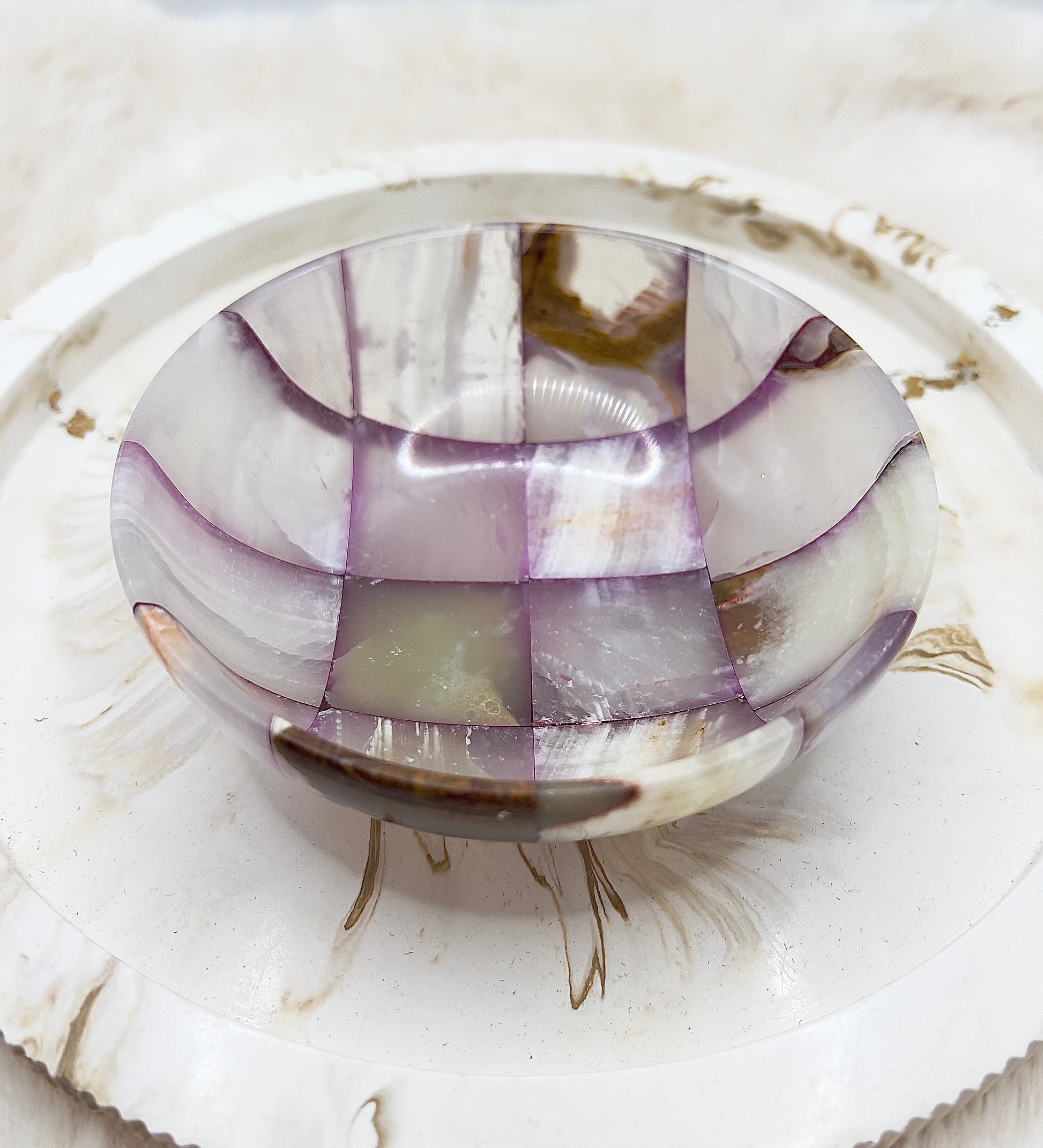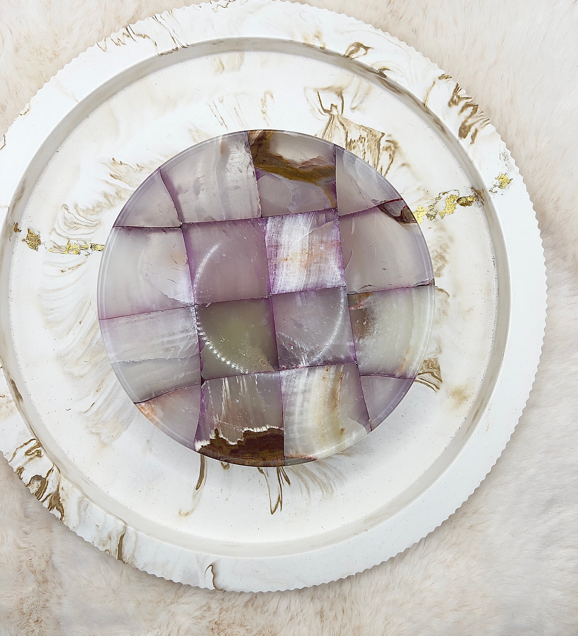 Diese einzigartige Onyx-Schale ist ein handgeschliffenes Natur-Unikat und begeistert durch ihre sanften, fließenden Farbverläufe in Creme, Weiß, Violett und zarten Braunnuancen. Die quadratisch gesetzten Naturstein-Elemente erschaffen ein wunderschönes, mosaikartiges Muster, das im Licht schimmert und jede Schale zu einem absoluten Einzelstück macht.