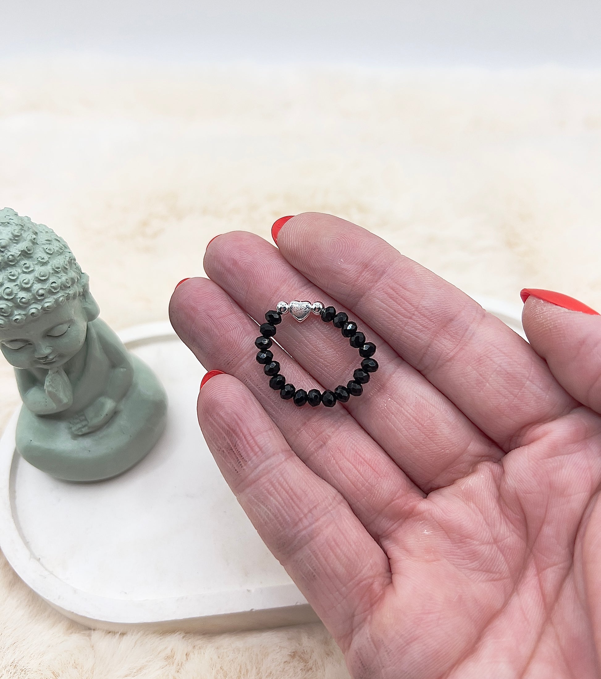 Dieser handgefertigte Edelsteinring aus facettiertem schwarzem Turmalin vereint schlichte Eleganz mit einem feinen, liebevollen Akzent. Die ca. 3,5 mm großen Edelsteinperlen werden durch ein kleineres Herz aus 925er Silber sowie passende Abstandsperlen aus 925er Silber harmonisch ergänzt.
