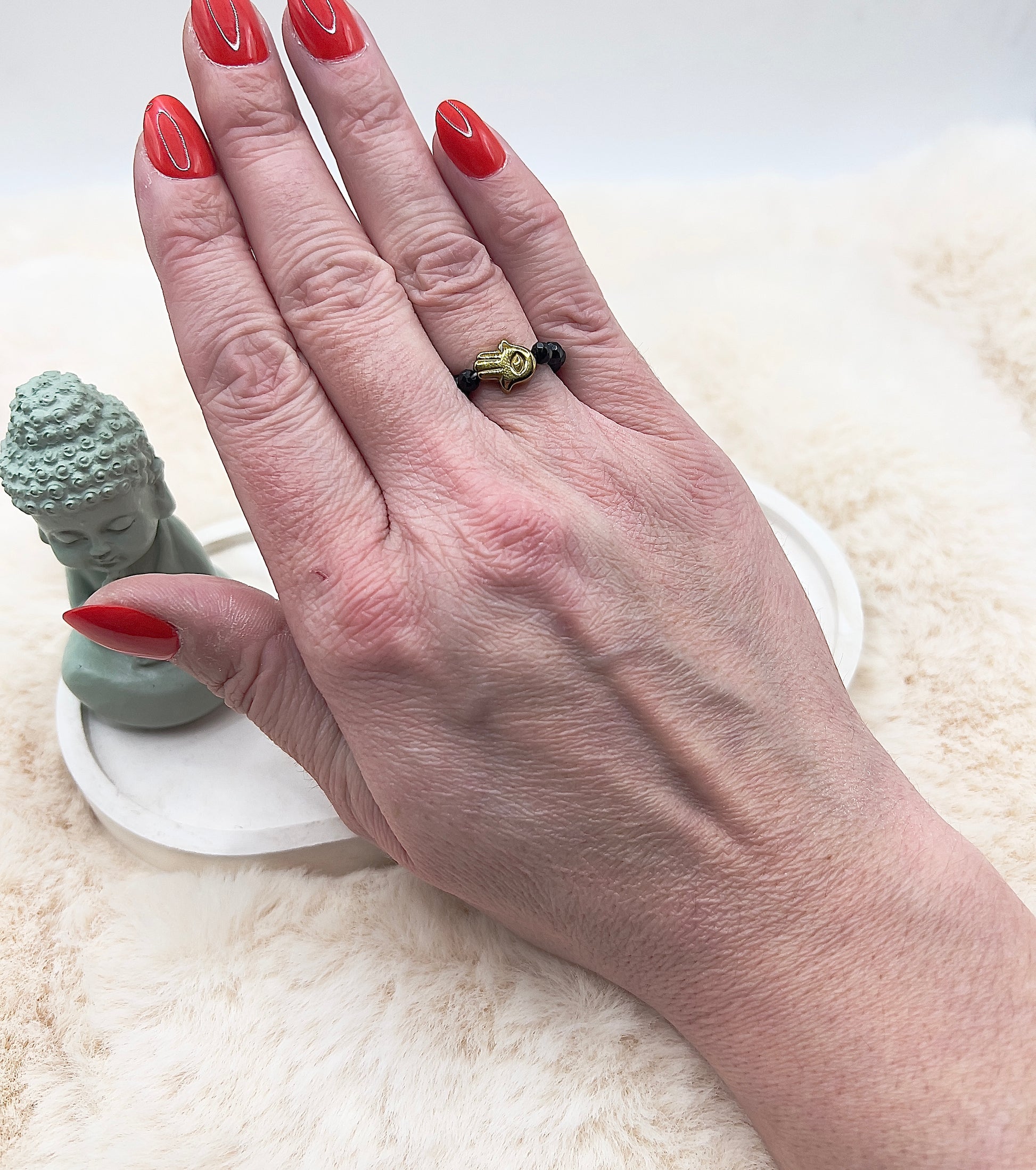 Dieser handgefertigte Edelsteinring aus facettiertem schwarzem Turmalin verbindet schlichte Eleganz mit einem symbolischen Detail. Die ca. 3,5 mm großen facettierten Edelsteinperlen werden durch eine vergoldet beschichtete Hamsa-Hand aus Edelstahl stilvoll ergänzt.