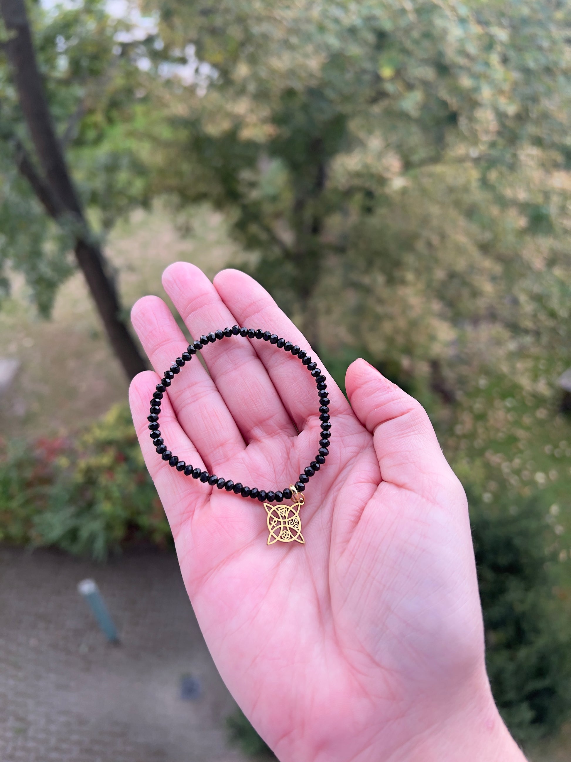 Die facettierten 3 mm Turmalinperlen funkeln dezent und wirken gleichzeitig tief schützend und erdend. Der vergoldete Hexenknoten steht für Ewigkeit, Unendlichkeit und den unbrechbaren Schutzkreis, der dich energetisch stärkt und negative Einflüsse fernhält.
