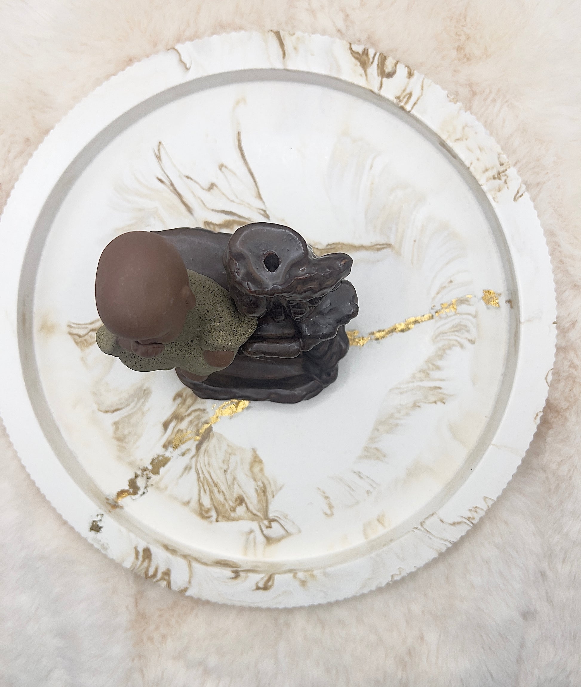Wird ein Rückfluss-Räucherkegel oben platziert, fließt der Rauch sanft wie ein kleiner Nebelwasserfall nach unten und sammelt sich ruhig im Sockel. An der Seite befindet sich zusätzlich eine kleine Öffnung, in der auch ein Räucherstäbchen verwendet werden kann – ideal für verschiedene Räucherarten und entspannte Rituale.