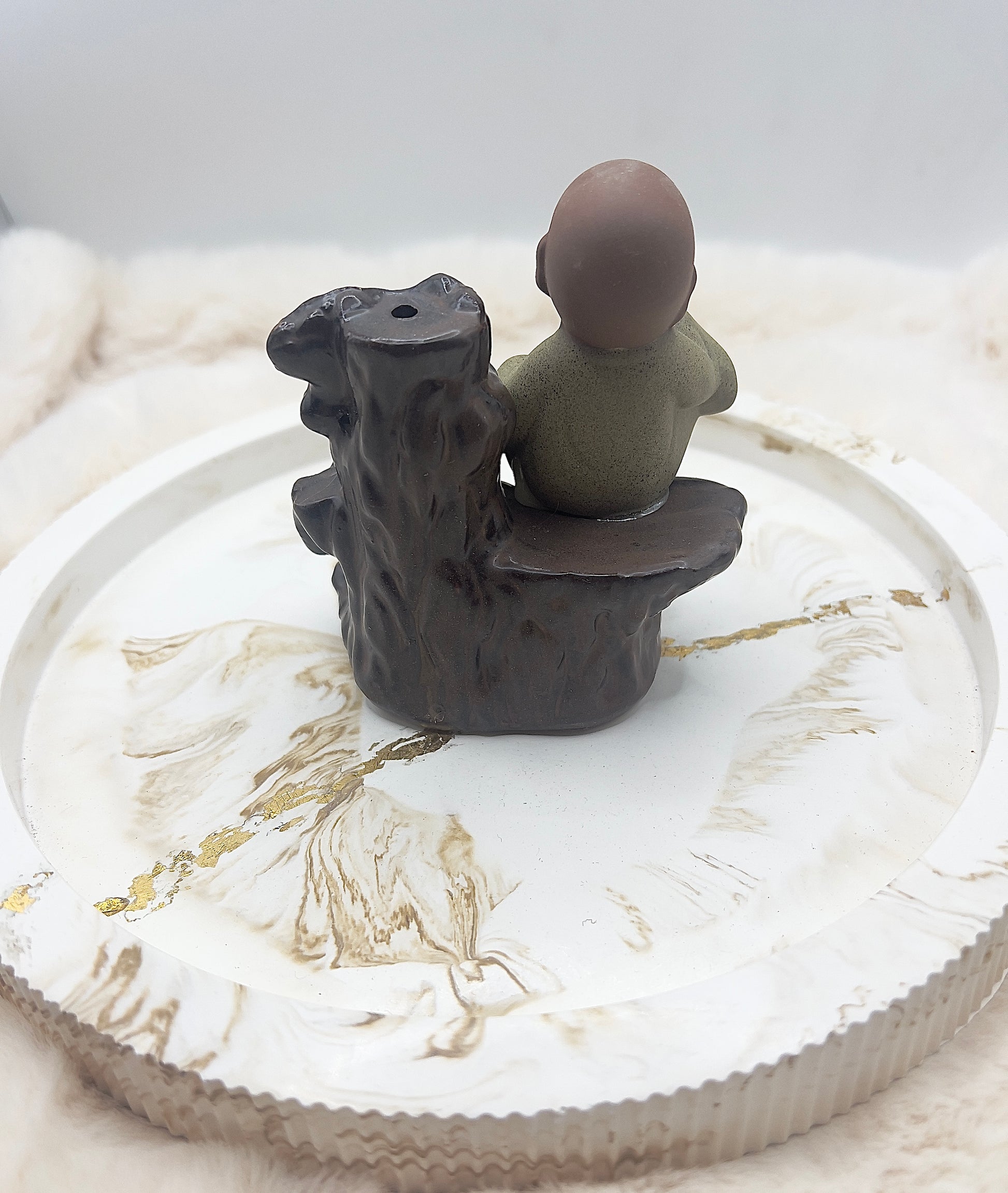 Dieser besondere Rückfluss-Räucherkegelhalter zeigt einen Buddha, der sich den Mund zuhält – inspiriert vom bekannten Symbol der Achtsamkeit und bewussten Zurückhaltung.