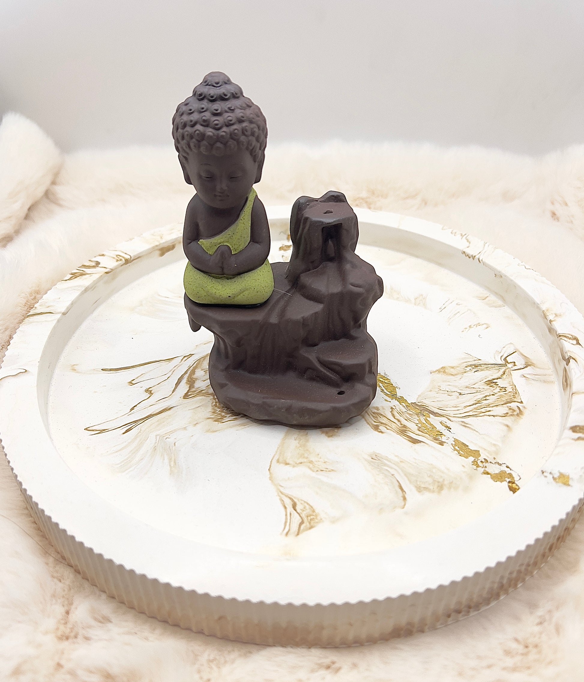 Dieser Rückfluss-Räucherkegelhalter zeigt einen Buddha in ruhiger Sitzhaltung, verziert mit einem grünen Gewand. Die Farbgebung wirkt harmonisch und natürlich und fügt sich dezent in unterschiedliche Wohn- oder Meditationsbereiche ein.