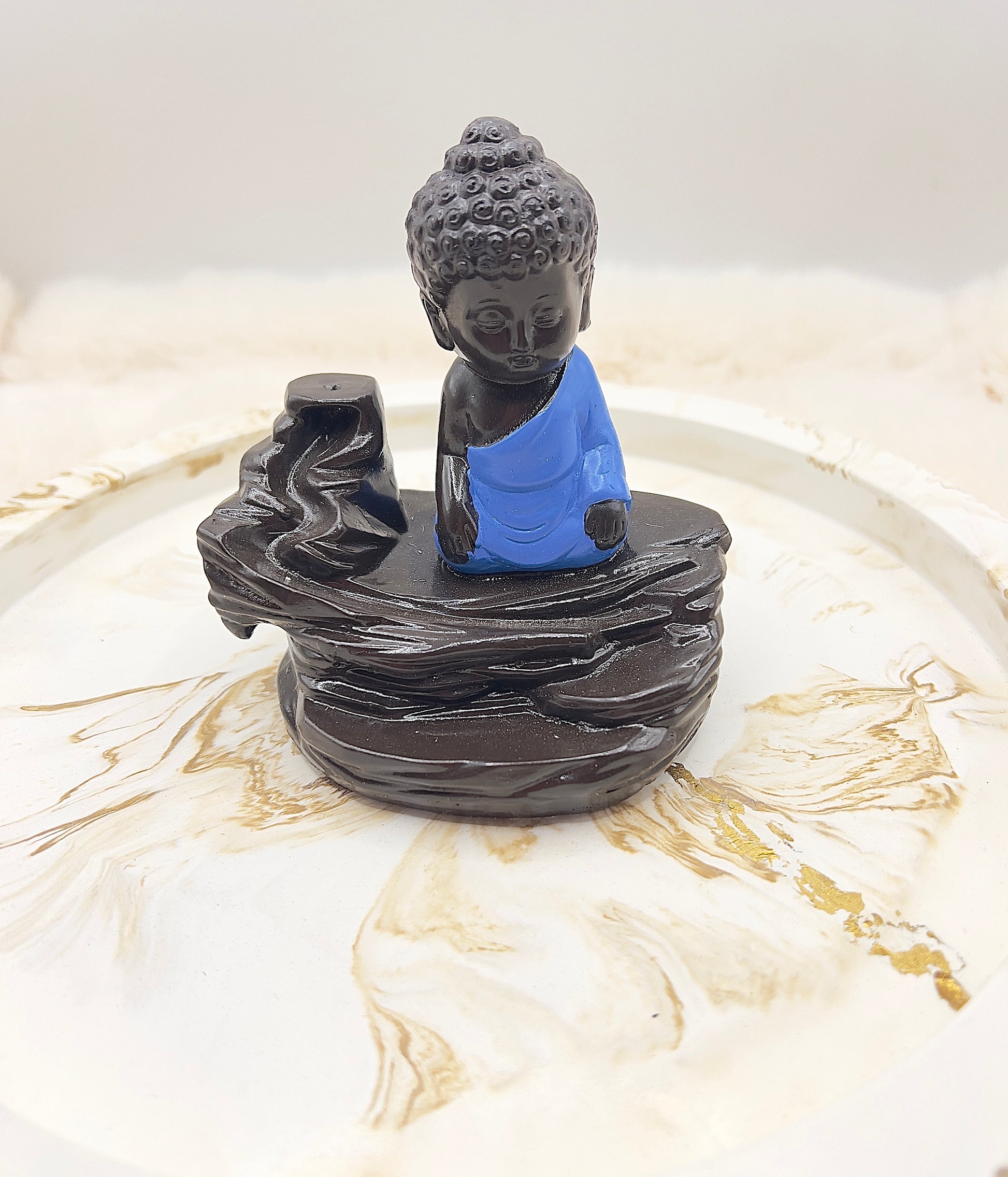 Dieser Rückfluss-Räucherkegelhalter zeigt einen Buddha in ruhiger Haltung mit einem blauen Gewand. Das schlichte, zeitlose Design wirkt harmonisch und fügt sich dezent in verschiedene Wohn- oder Meditationsbereiche ein.