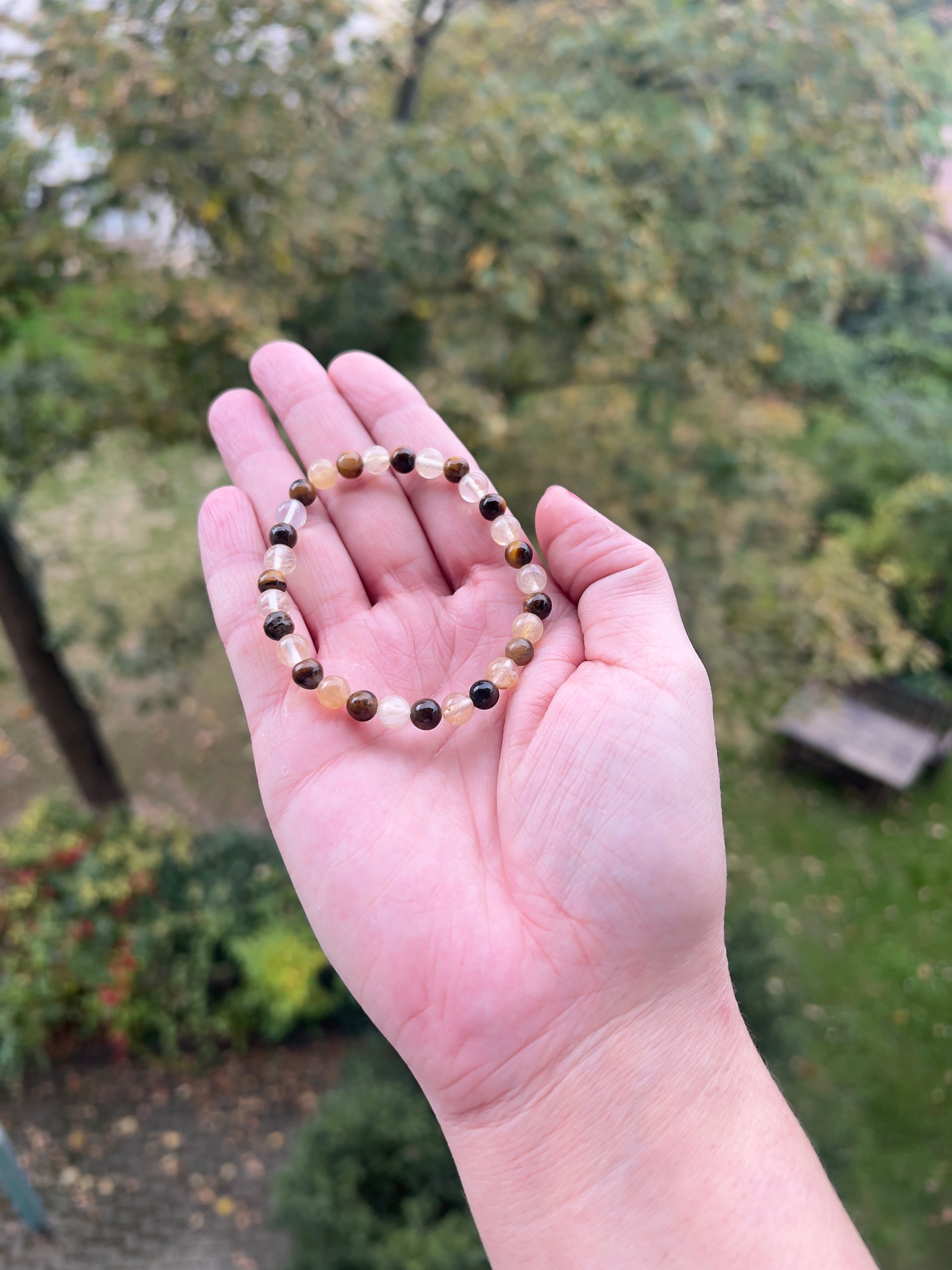 Die 6 mm Perlen schimmern in goldgelben und braun-goldenen Nuancen und erinnern an Sonnenlicht, das durch Bernstein fließt. Zusammen bilden sie eine kraftvolle Kombination für Selbstvertrauen, Fülle und innere Stabilität.